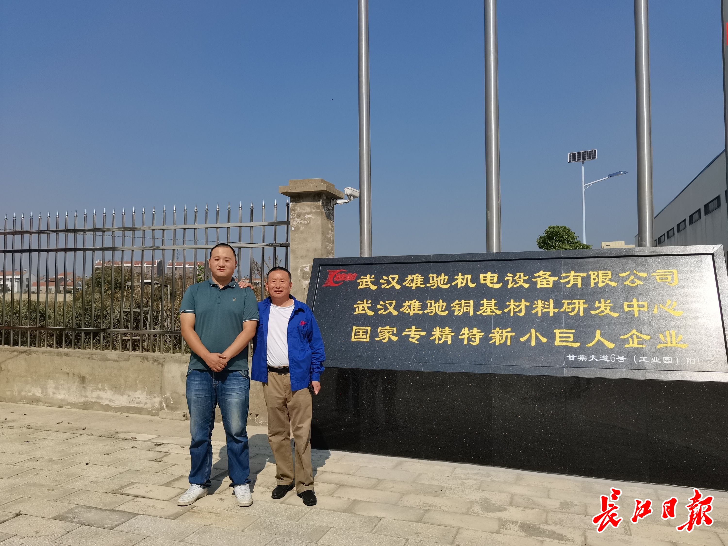 周尤利(右)和儿子周雄(左)在落成不久的雄驰铜基材料研发中心门前合影。长江日报记者 万凌 摄