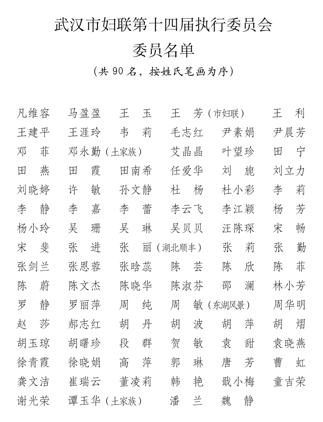 据武汉市妇女联合会官方微信公众号“武汉女性”消息显示,11月8日下午,市妇联第十四届执行委员会举行第一次全体会议。会议选举产生了武汉市妇联第十四届主席、副主席和常务委员,并公布执行委员会委员名单。