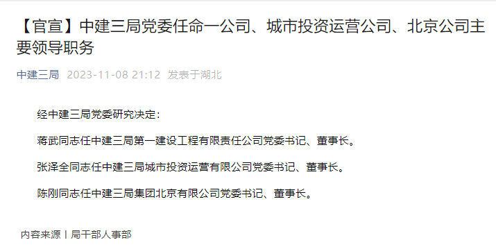 张泽全同志任中建三局城市投资运营有限公司党委书记、董事长。