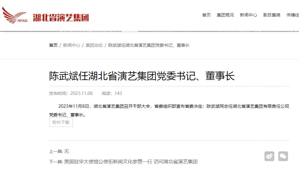 据湖北省演艺集团官网消息显示,2023年11月8日,湖北省演艺集团召开干部大会,省委组织部宣布省委决定:陈武斌同志任湖北省演艺集团有限责任公司党委书记、董事长。
