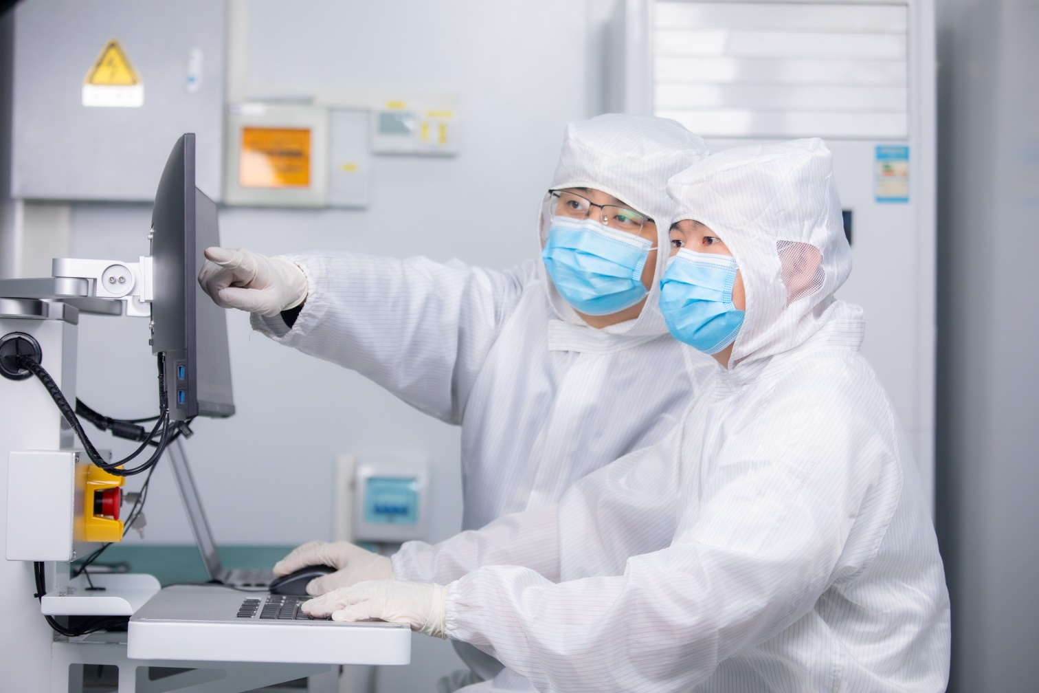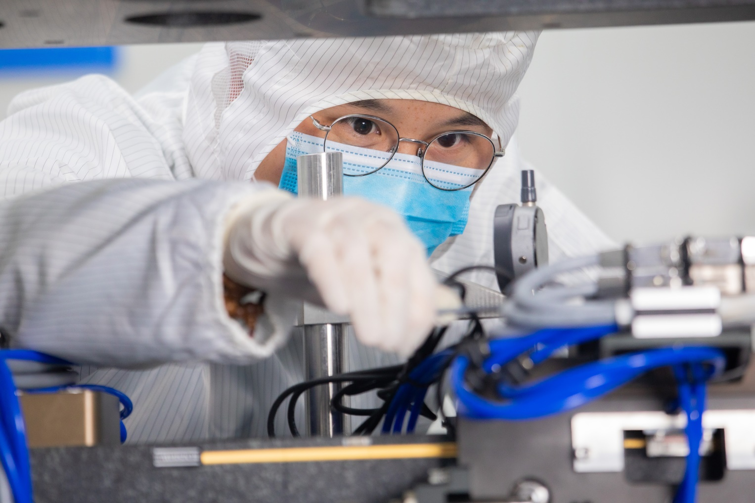 研发人员正在进行半导体晶圆缺陷检测设备平整度调试。