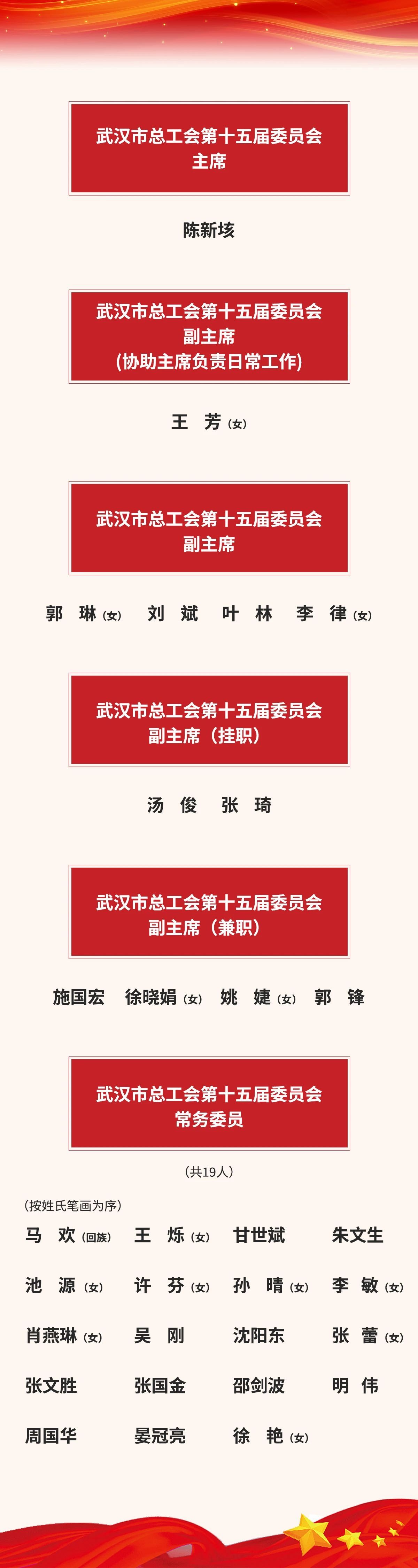 长江日报大武汉客户端11月17日讯(记者谭德磊 通讯员贺鹏)11月17日下午,市总工会第十五届委员会第一次全体会议召开,选举产生了武汉市总工会第十五届委员会主席、副主席和常务委员。陈新垓当选为武汉市总工会主席。