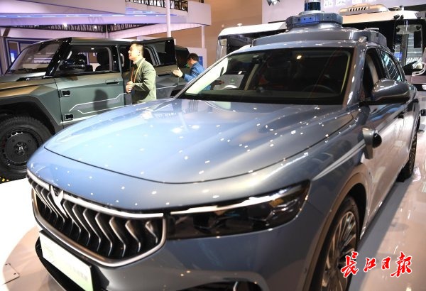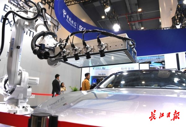 中国电信展示的视比特机器人用高清工业相机为汽车外观进行检测。