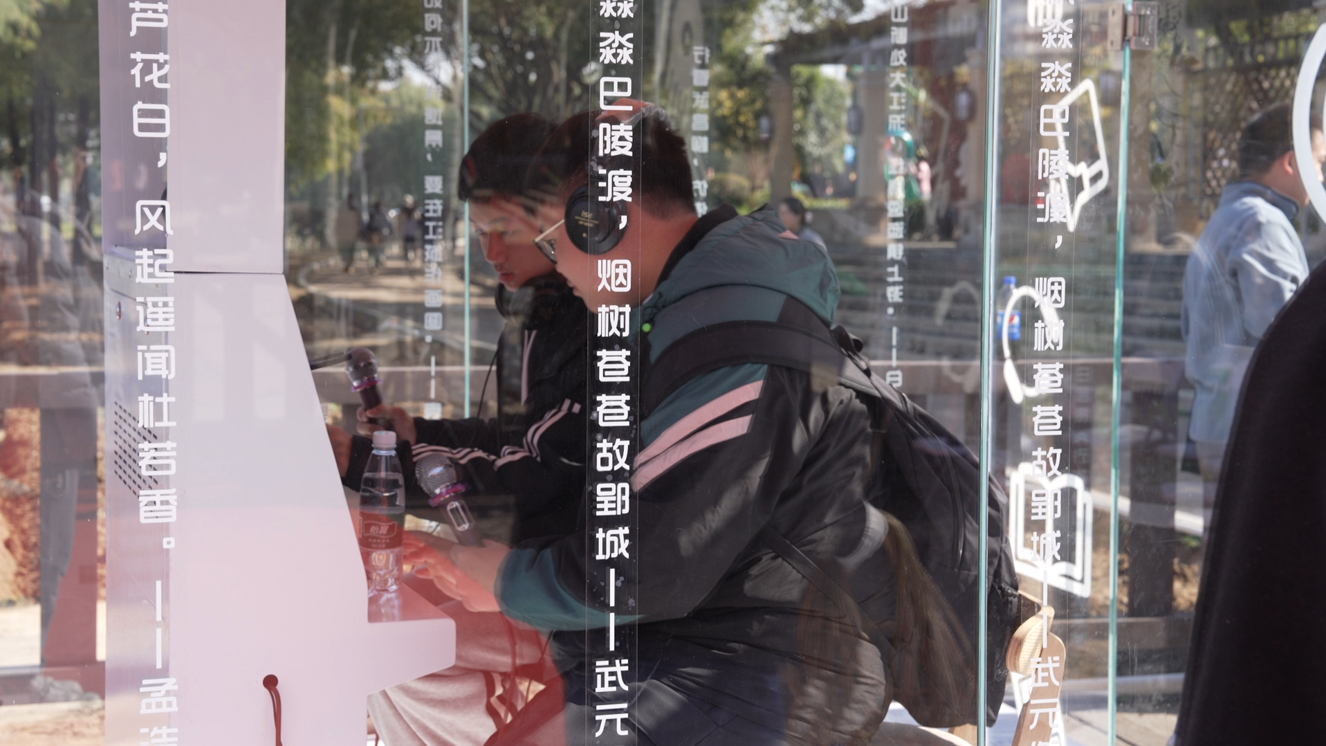 记者在现场看到,“文学青春朗读亭”临湖而建,整体风格显得精美而温馨,四周采用高强度全隔音钢化玻璃,与周边自然环境融为一体,玻璃上和周边地面上,一行行诗句错落有致,为这方天地更添诗情画意。内部的数字化设备一应俱全,一部朗读显示屏、两个话筒、耳麦、两张高脚凳,为朗读者提供了功能全面、环境舒适的阅读空间。