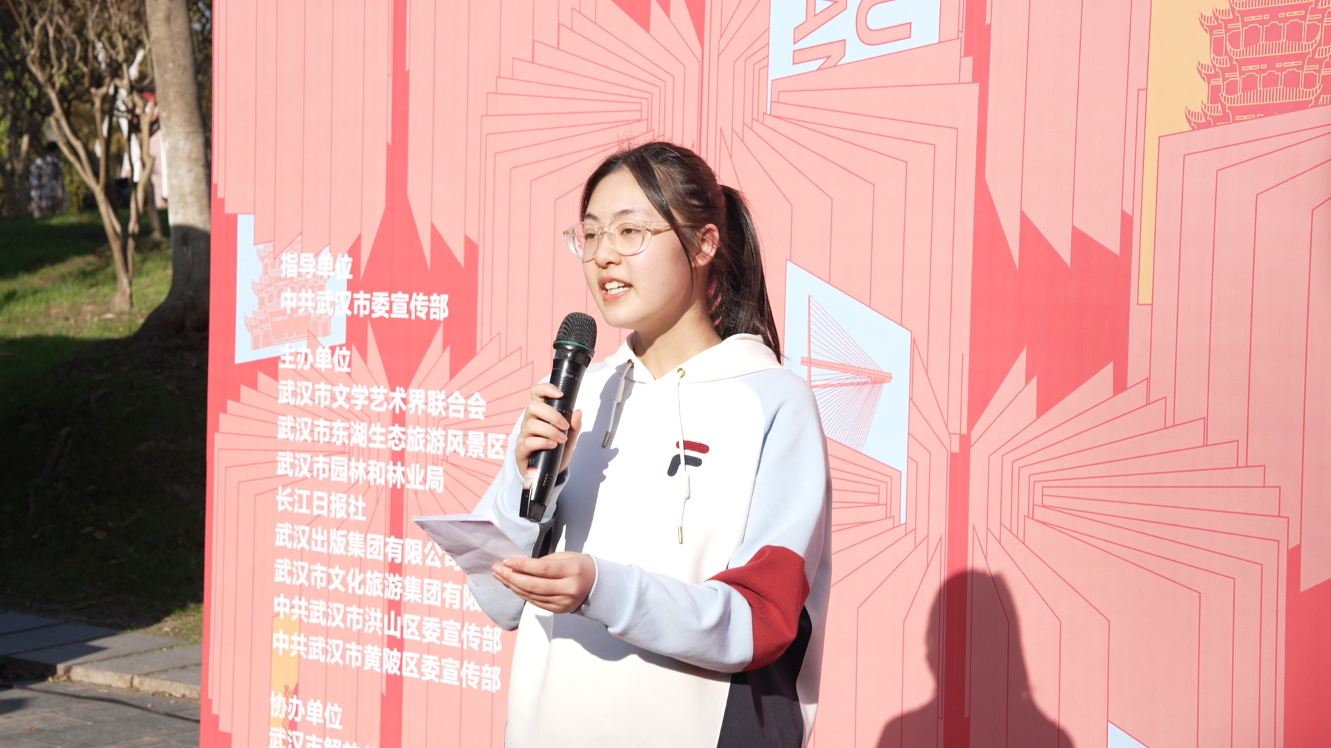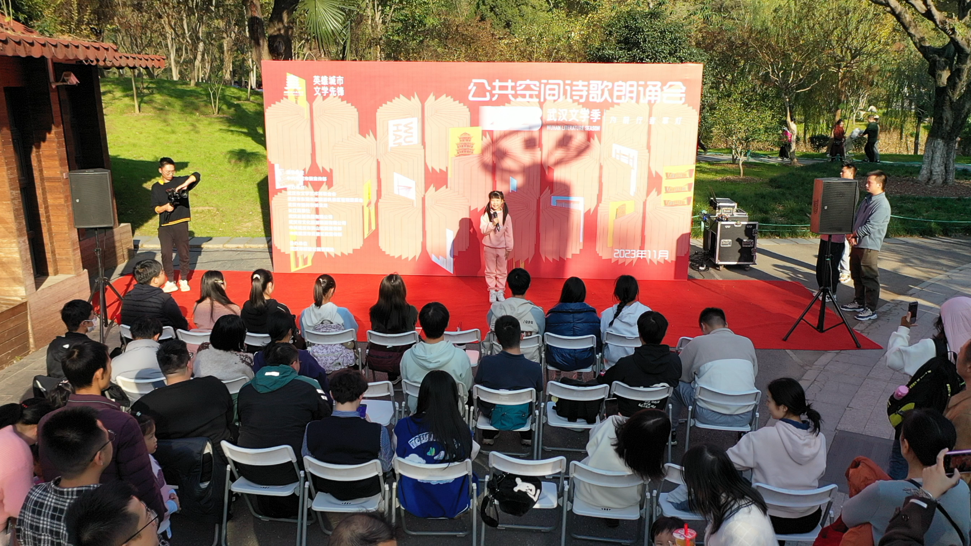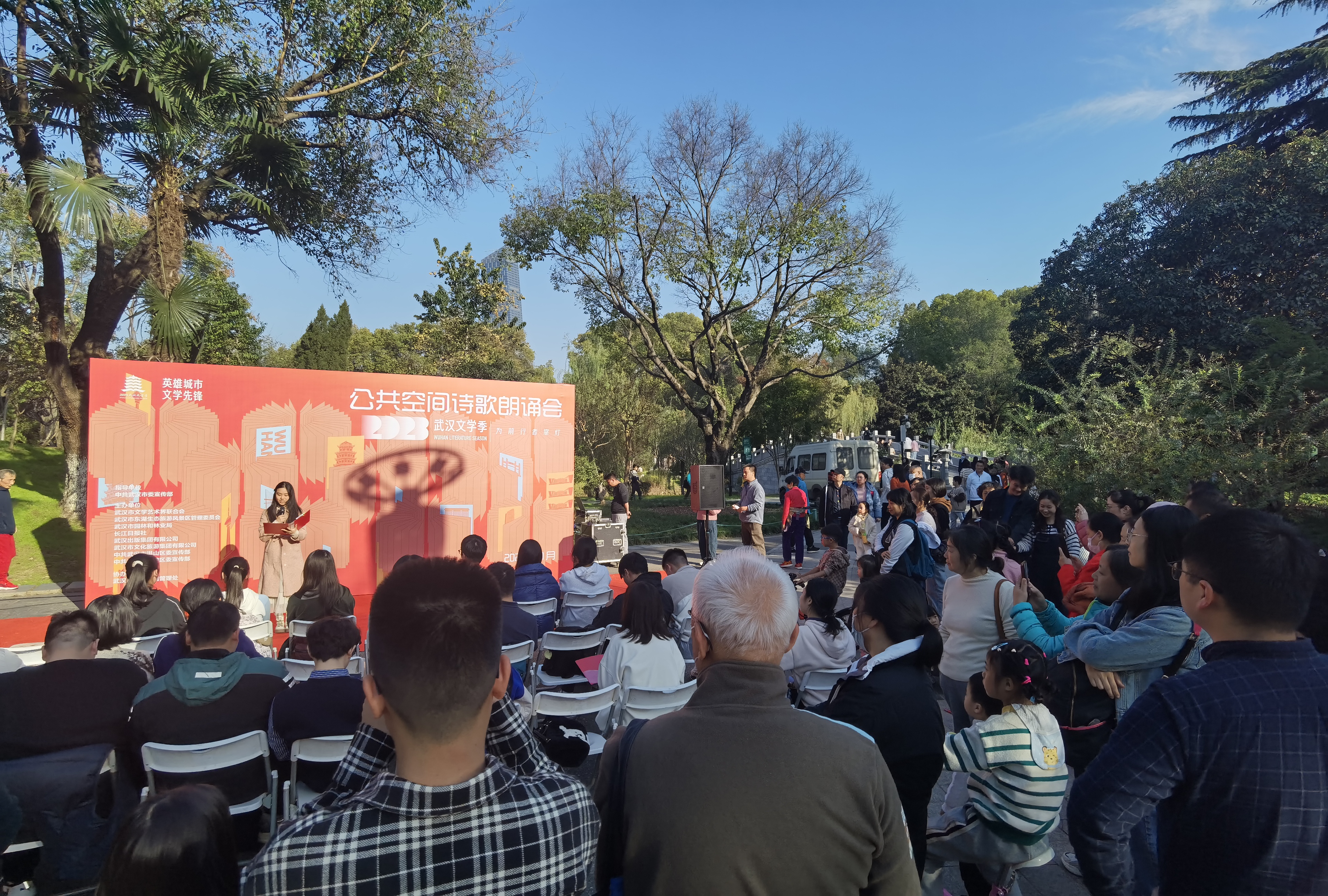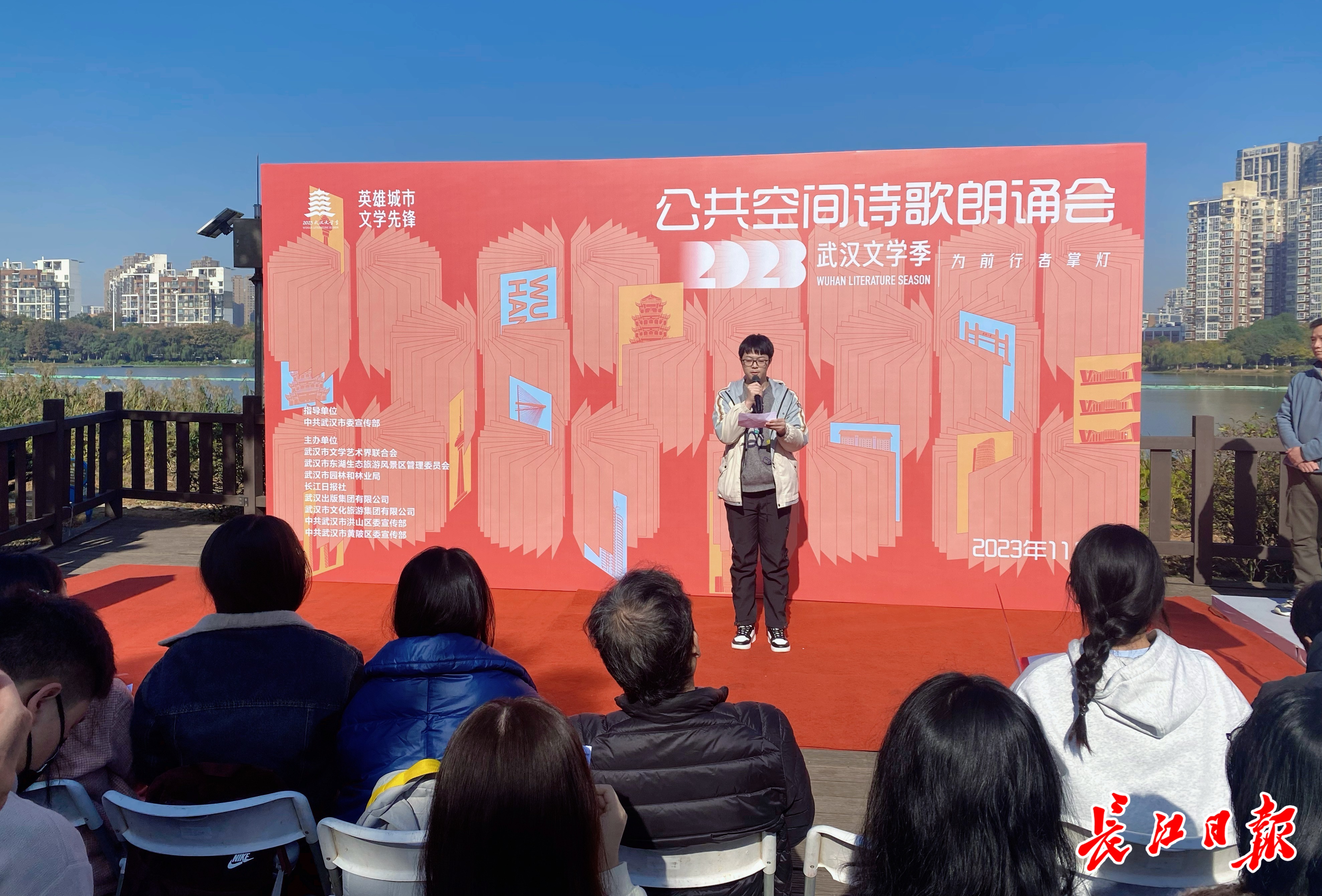 长江日报大武汉客户端11月19日(记者叶飞艳)11月19日,“英雄城市 文学先锋”2023武汉文学季在南湖幸福湾公园、解放公园接连举办两场公共空间诗歌朗诵会。武汉本土诗人、青年学生和市民一起通过诗歌感受武汉的青春活力。位于洪山南湖幸福湾公园的“文学青春朗读亭”也迎来了它的首批朗读者。