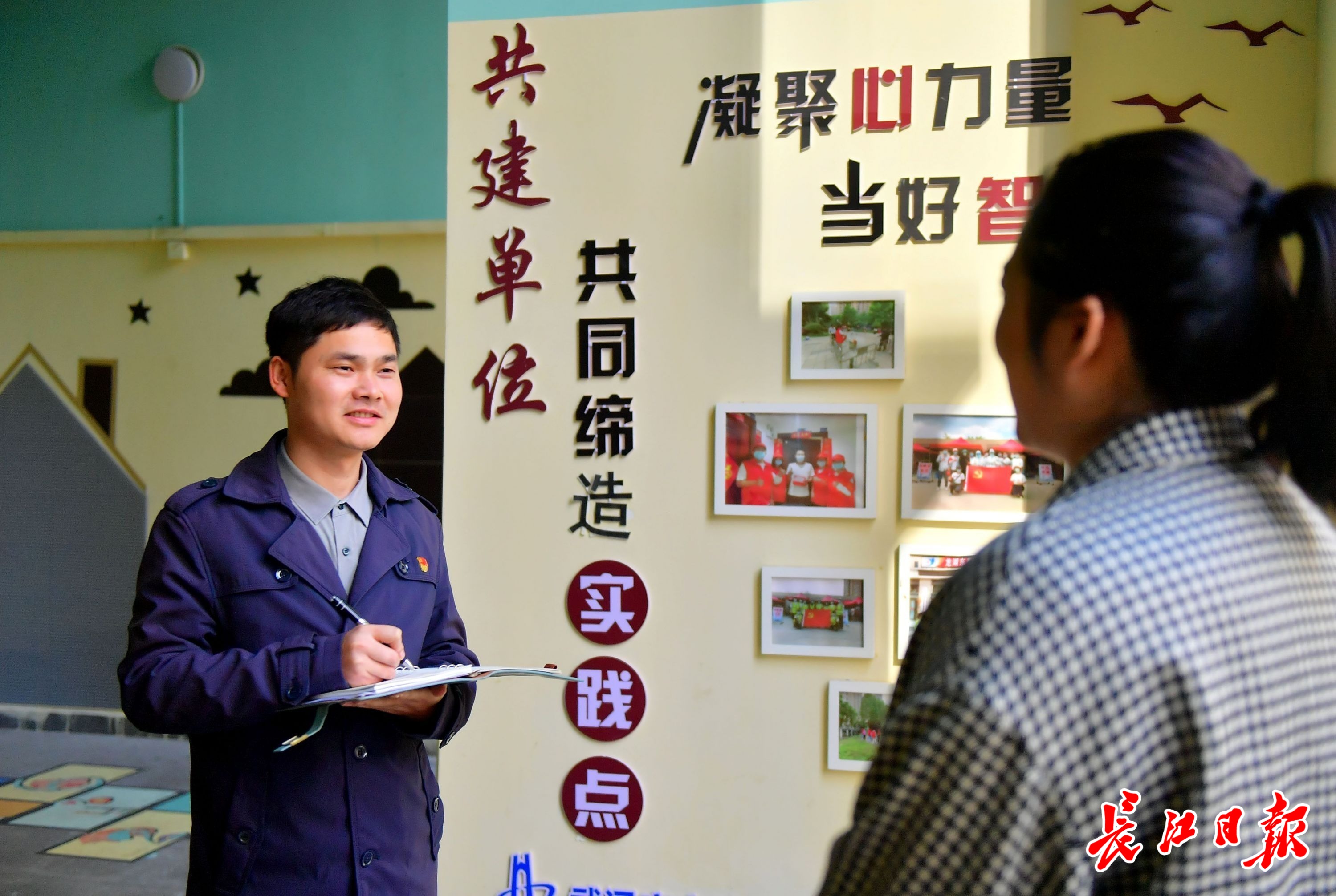 蔡彬(左)被选派到汉阳区龙阳街道龙湖东岸社区实践锻炼,主动走访、联系社区居民,用心、用情为群众办实事。长江日报记者刘斌 摄