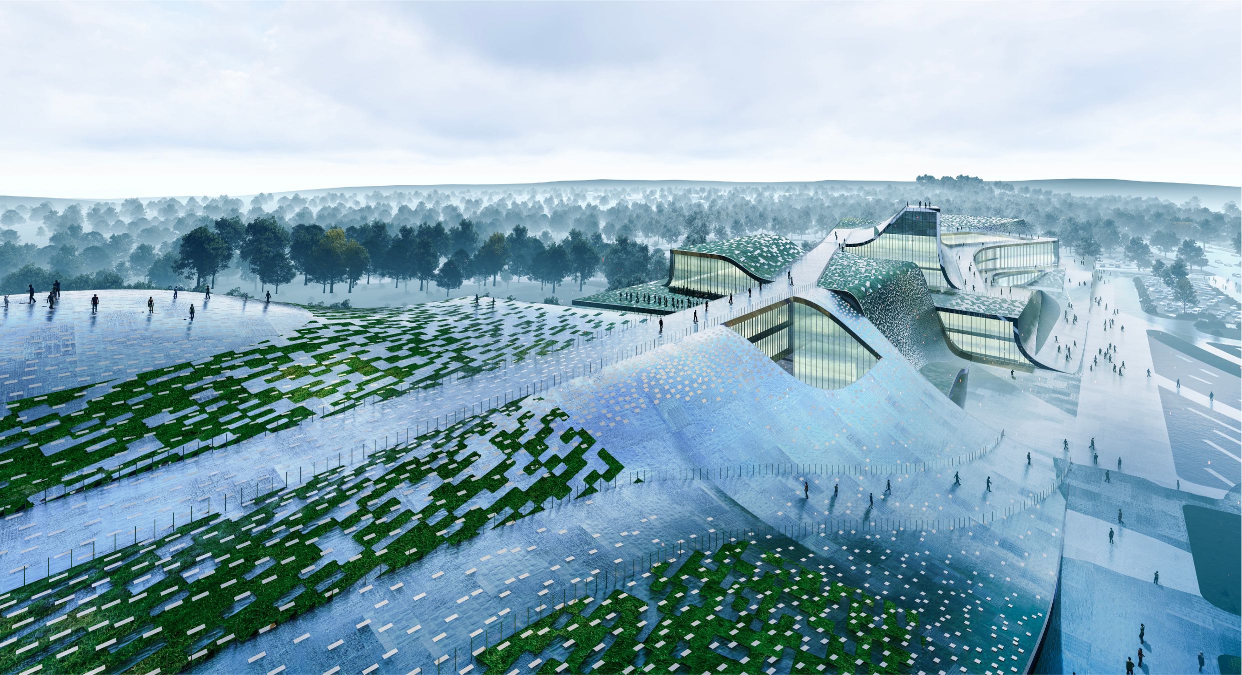 登上3万平方米的屋顶,视觉开阔,可俯瞰高罗河湿地公园全景,远眺高楼林立的创新示范带。