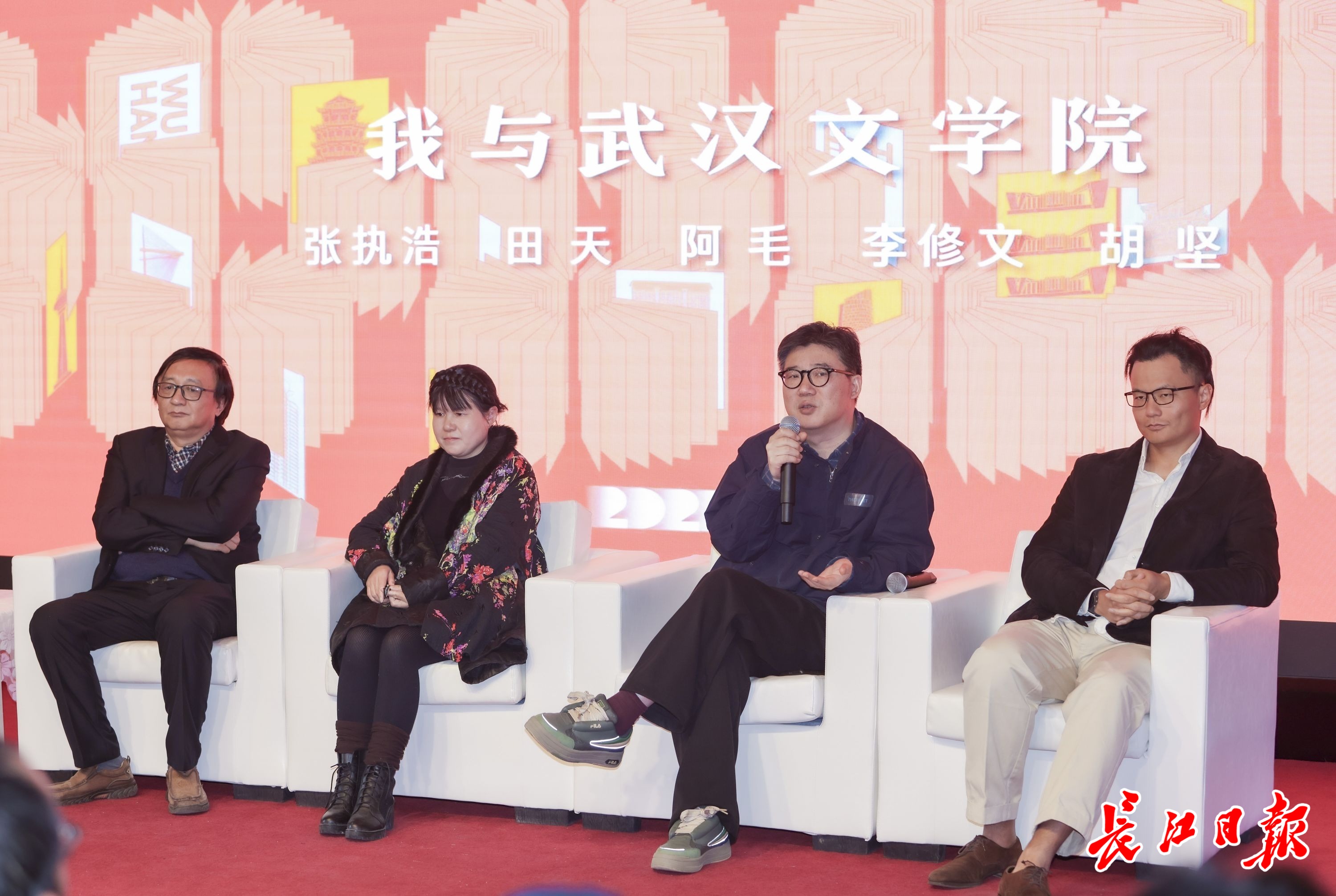 作家田天、阿毛、李修文、胡坚(从左至右)对话环节“我与武汉文学院”。长江日报记者 胡冬冬 摄