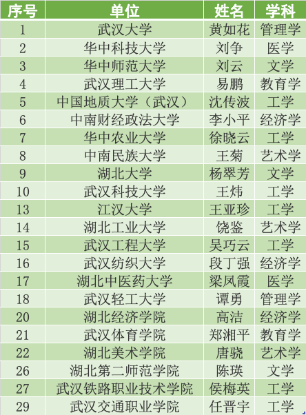 武汉有30位老师入围教育系统楚天名师,其中高等学校老师22位,中等及以下学校老师8位;1位老师入围党校(行政学院)系统楚天名师。具体名单如下: