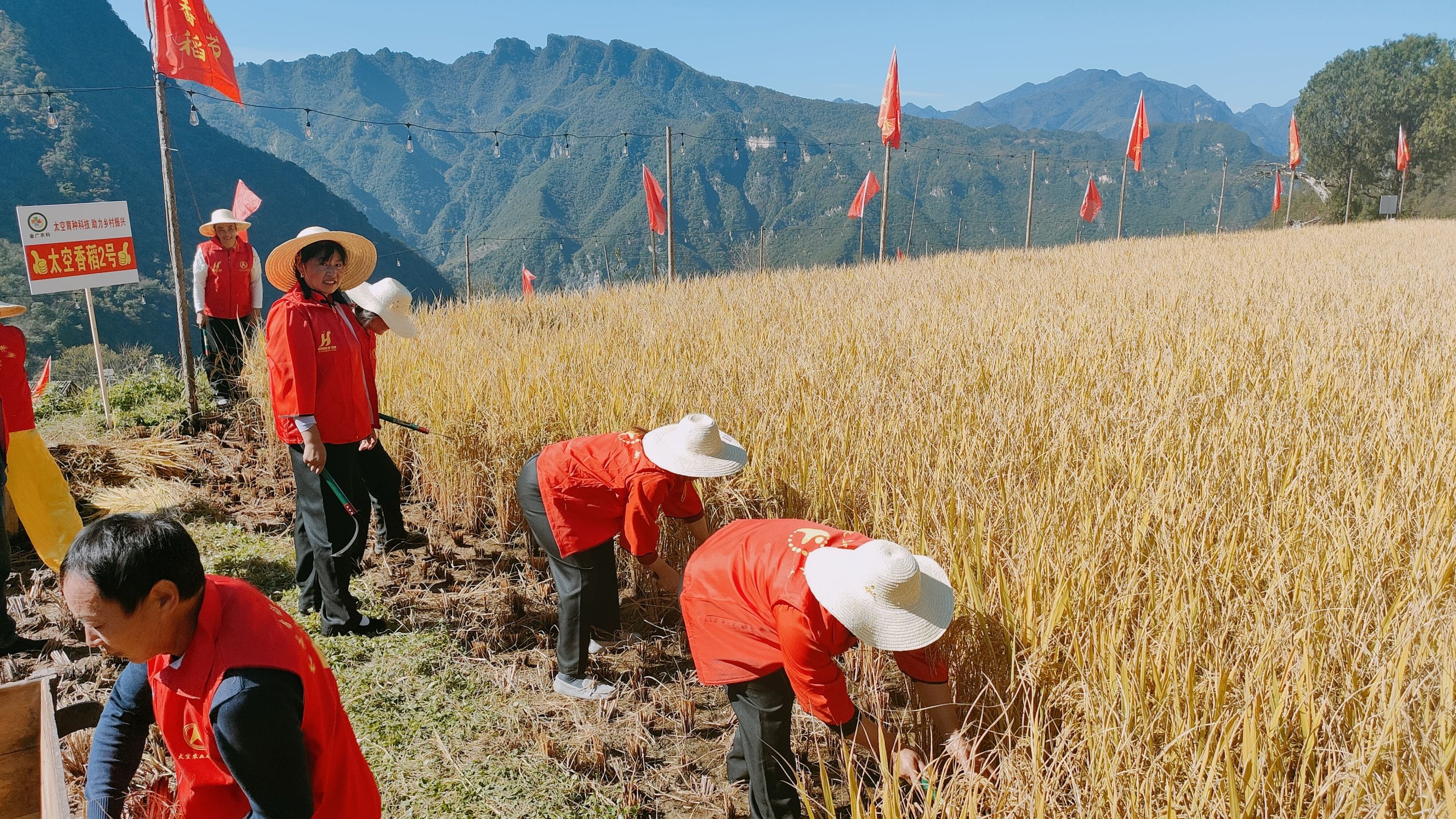 湖北金广神农架基地2023太空香稻丰收节,村民收割太空香稻。