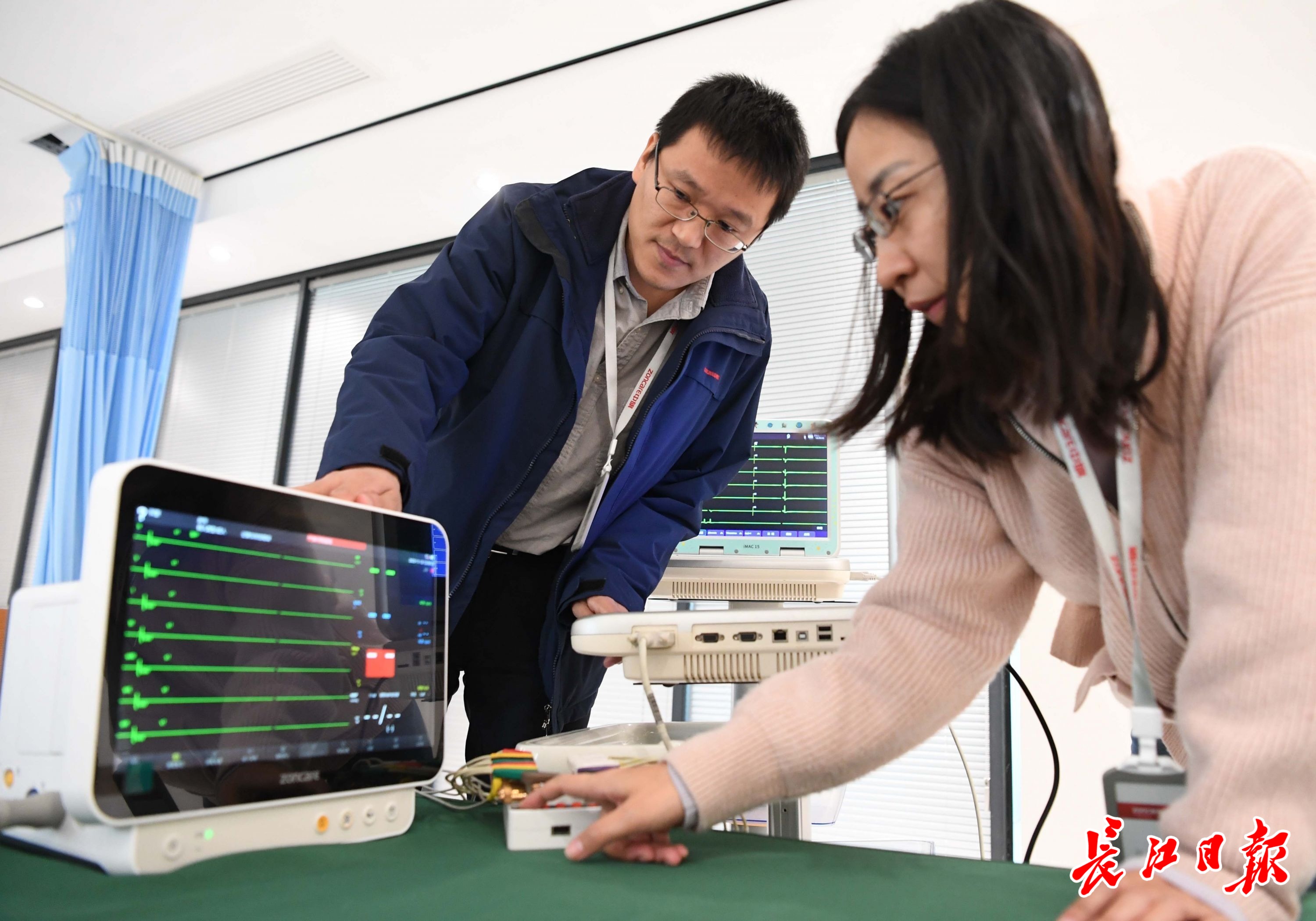 朱佳兵和研发人员在对智能心电算法-导联推导的有效性进行验证。长江日报记者高勇 摄