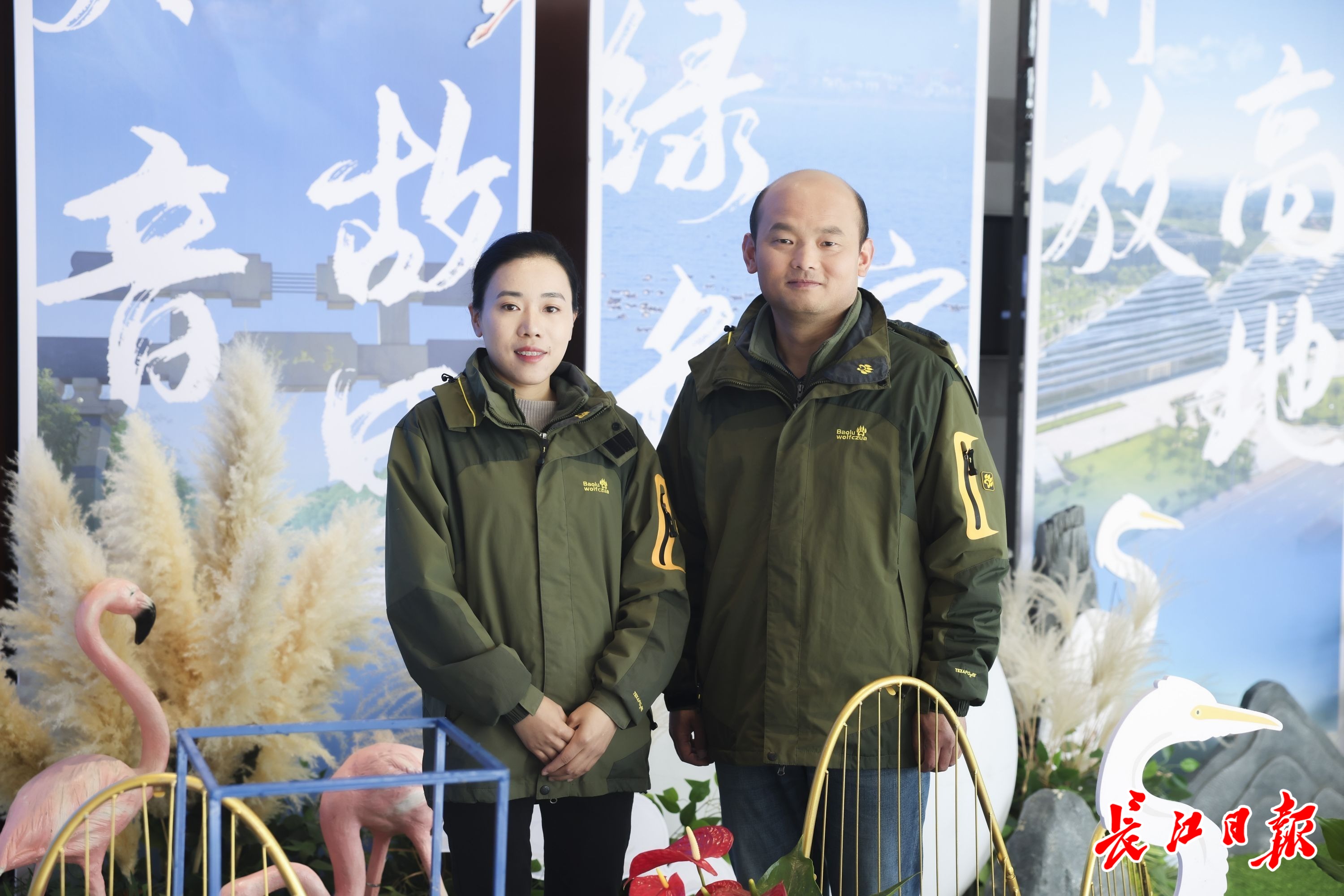 12月1日,“英雄城市新征程”系列形势政策报告会蔡甸区专场举行。图为蔡甸区沉湖湿地自然保护区管理局工程师冯江(右)、谭文卓(左)站在蔡甸区专场报告会会场门口附近的打卡点合影。长江日报记者胡冬冬 摄