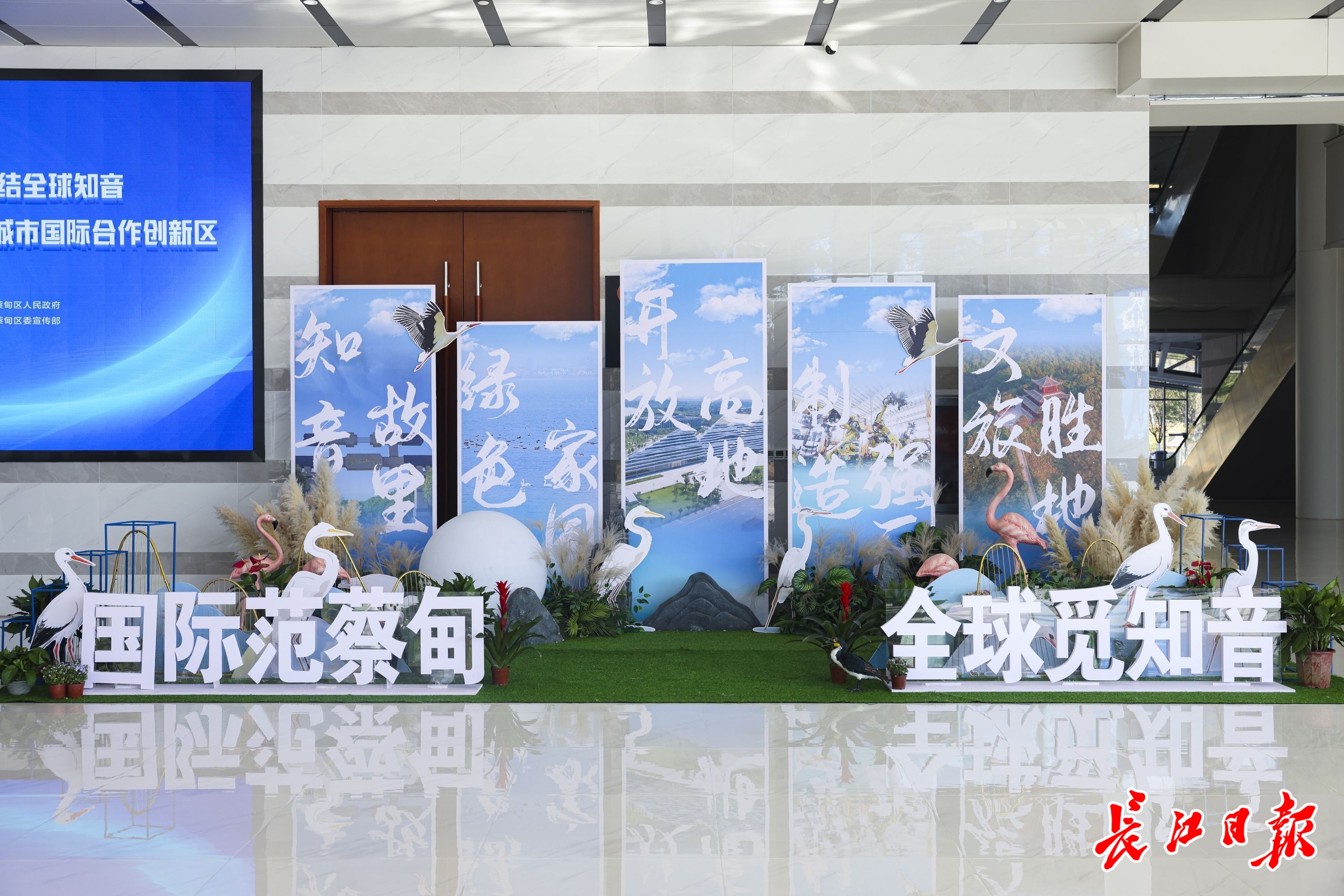 记者注意到,在蔡甸区专场报告会会场门口附近,还设置了一个打卡点。打卡点集中展示了出现在沉湖湿地的火烈鸟等鸟类造型,引得不少观众驻足观看。