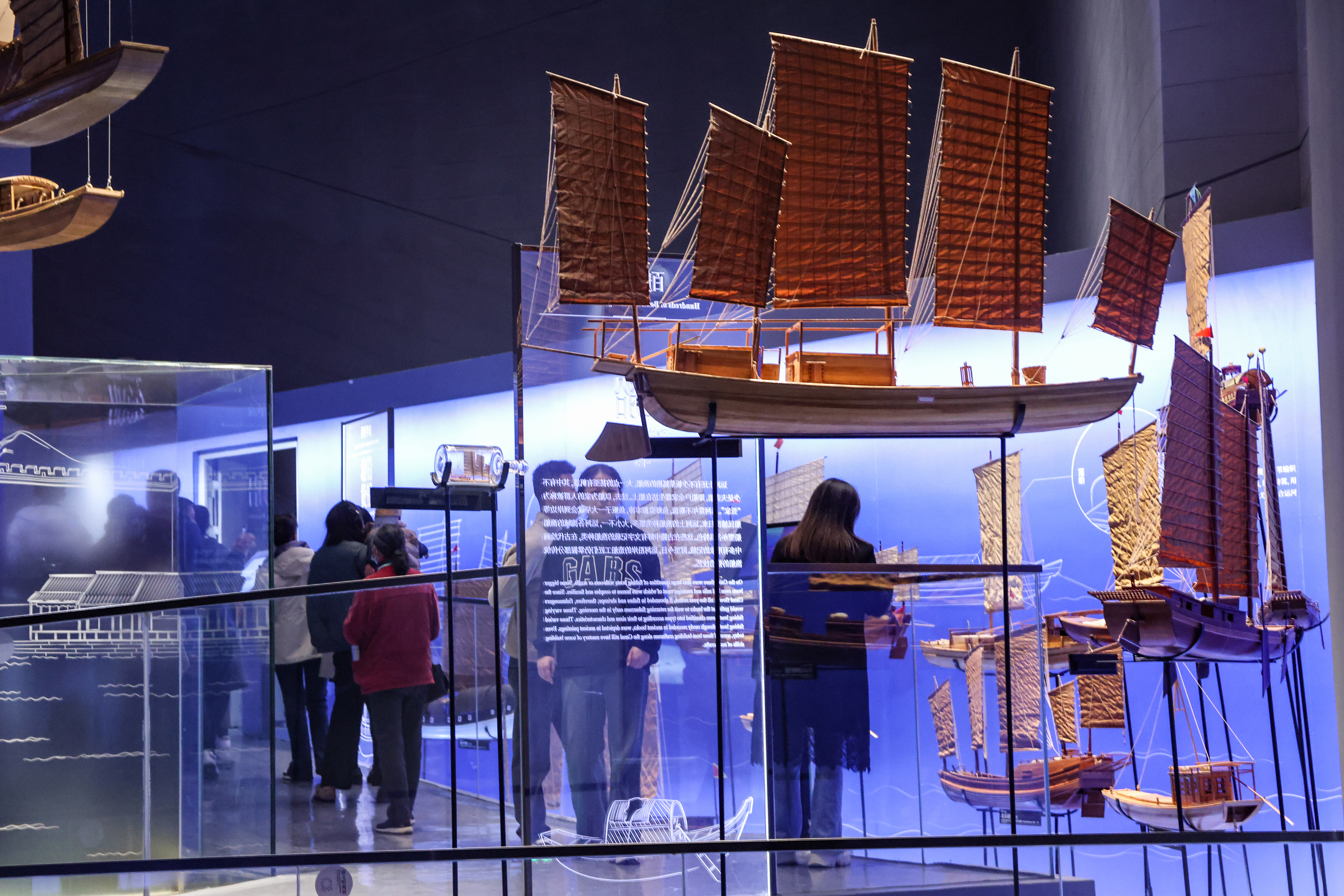 沙飞船是清朝的一种豪华客船,装饰考究、稳定性强。中国大运河博物馆特意辟出空高17米的场地,以1:1.4的比例复原了一艘沙飞船,船长20.6米,外宽4.2米。探访团员走进宽大船舱,通过船头和舷窗两个视角,身临其境感受当年舟行大运河时一路所见的景象。