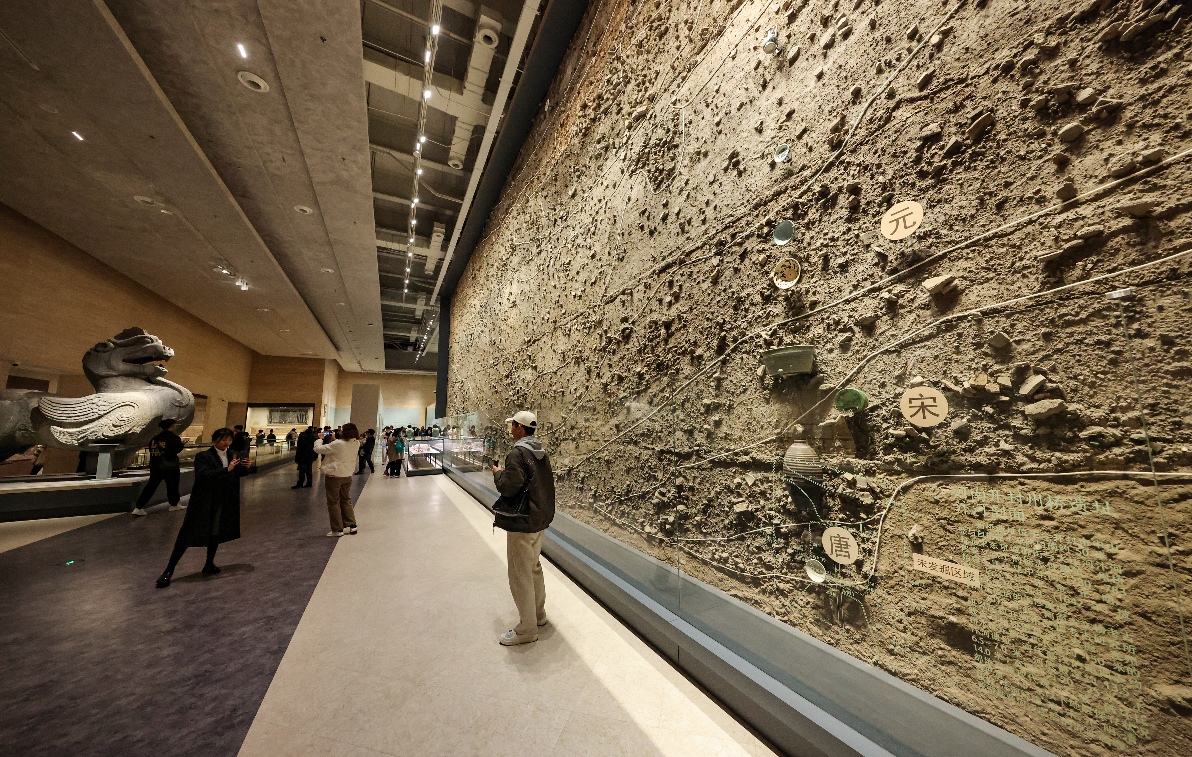 大运河博物馆讲解员徐杨介绍,这幅图来自河南开封州桥遗址,横宽25.7米、纵高8米,厚度为1—3厘米,是目前国内揭取的体量最大的土遗址剖面。截至2020年12月,考古人员在现场发掘深度达十余米,较完整揭露唐代至清代汴河河道堆积。