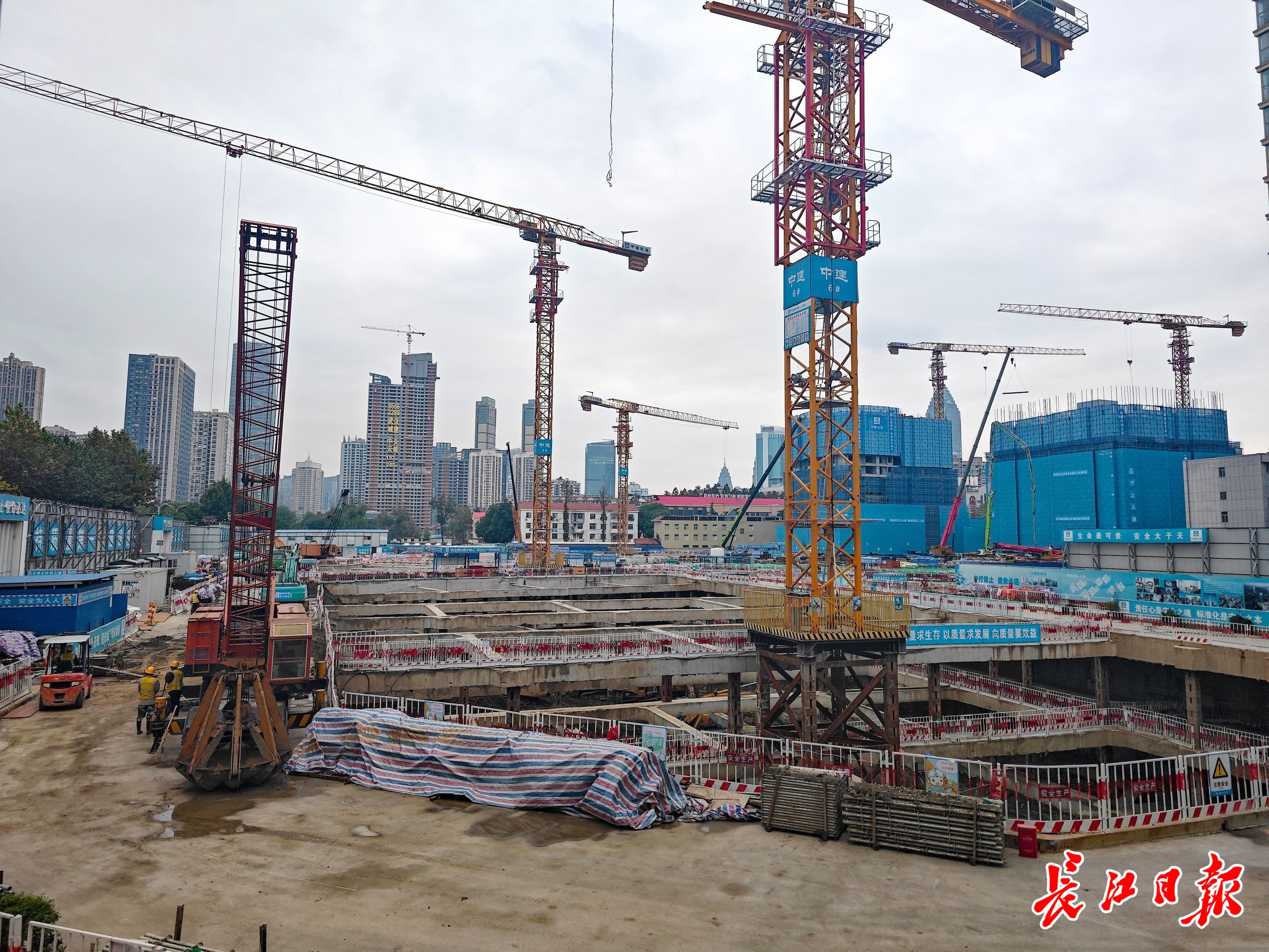 江汉区万松街道武汉三镇中心工地作业进行得如火如荼。见习记者陈星雨 摄