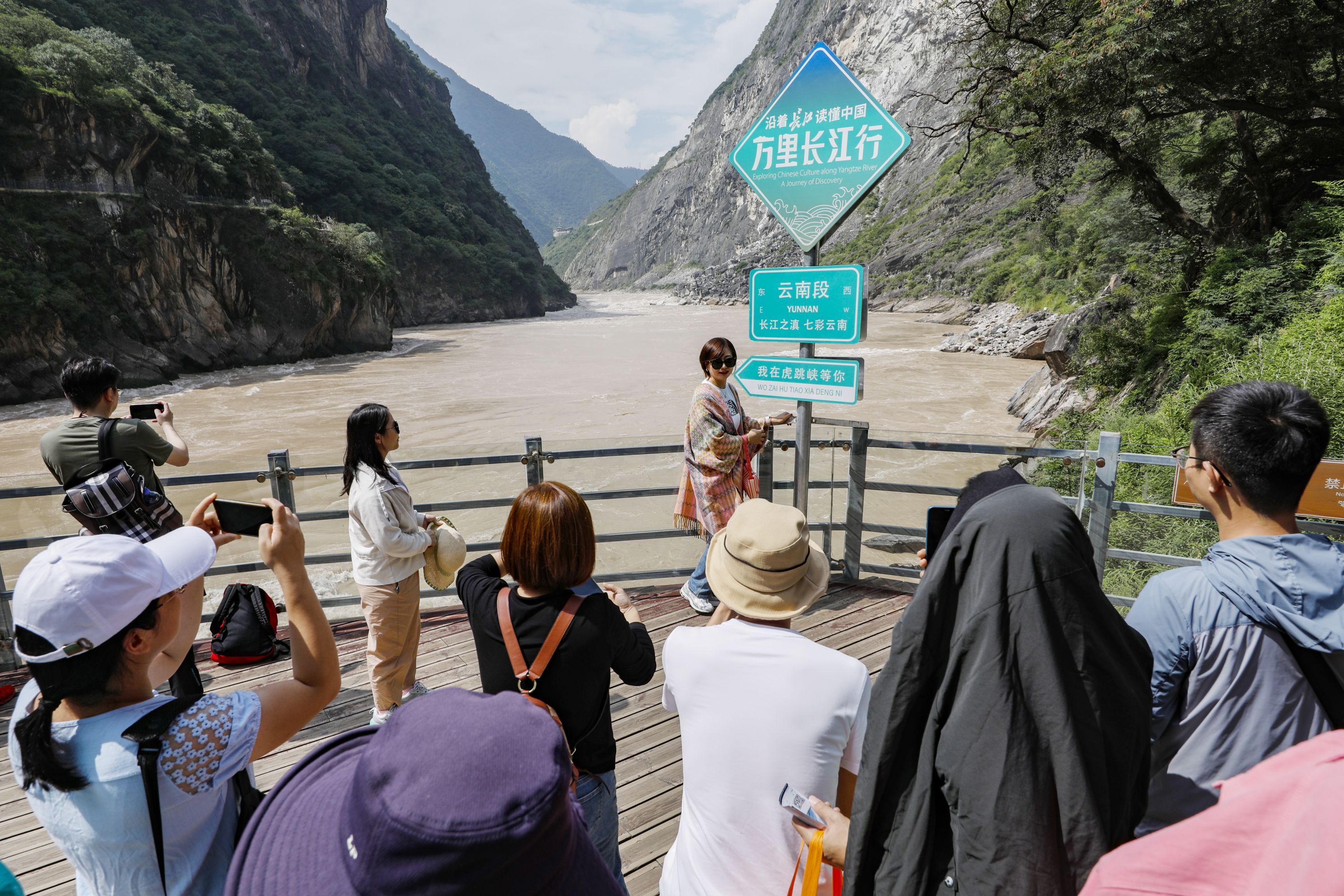 探访团一行在云南虎跳峡设置的打卡点吸引游客们打卡。探访团成员王筝 摄