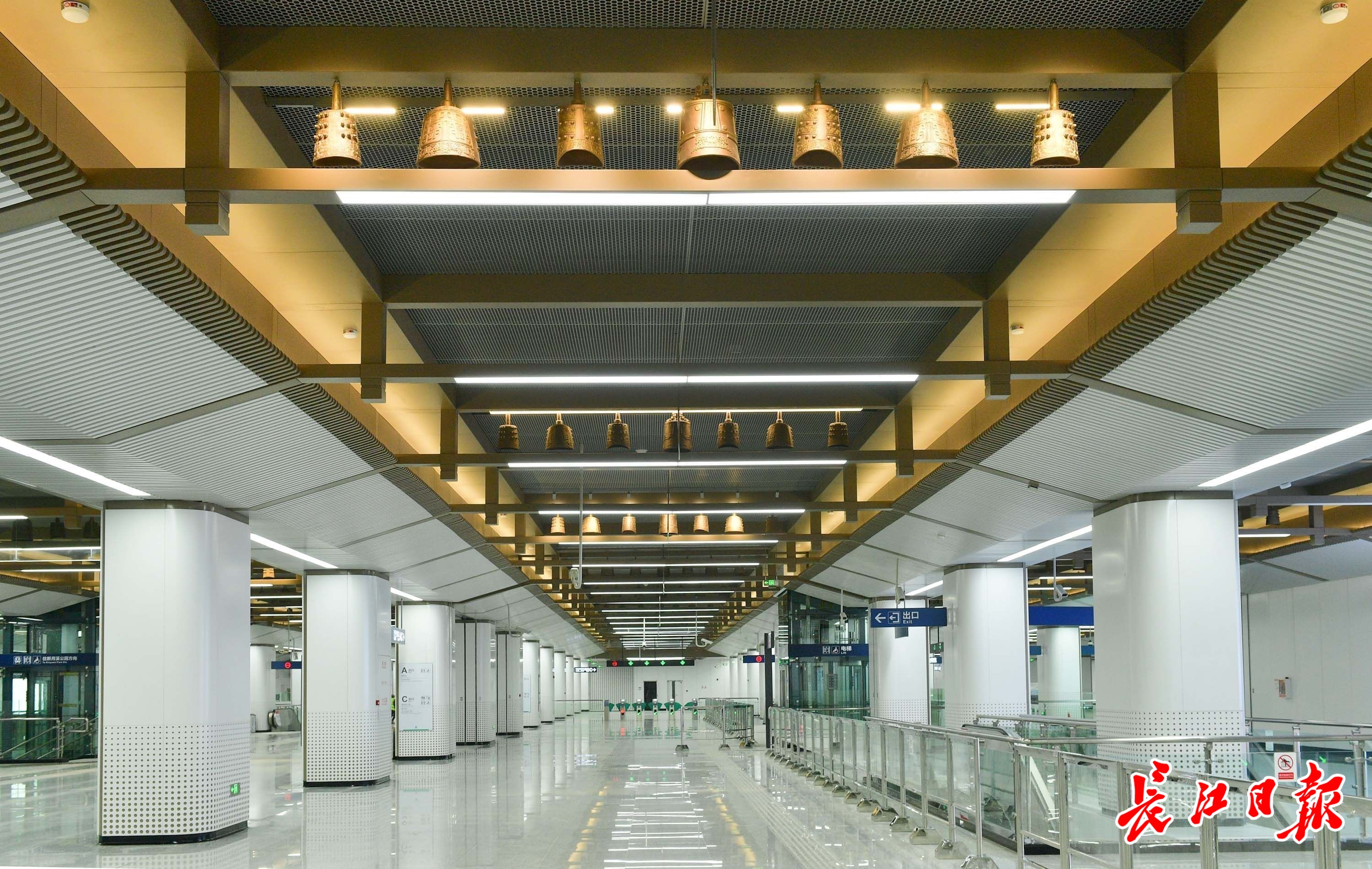 武汉地铁股份公司二级项目经理李家春介绍,武汉站西广场站设计主题为“楚韵钟声”,整座车站设计充分体现楚文化,为乘客打造出具有楚风韵味的车站环境。车站整体空间提取了湖北省博物馆楚文化馆建筑元素,展现楚地古代音律艺术的巨大成就。