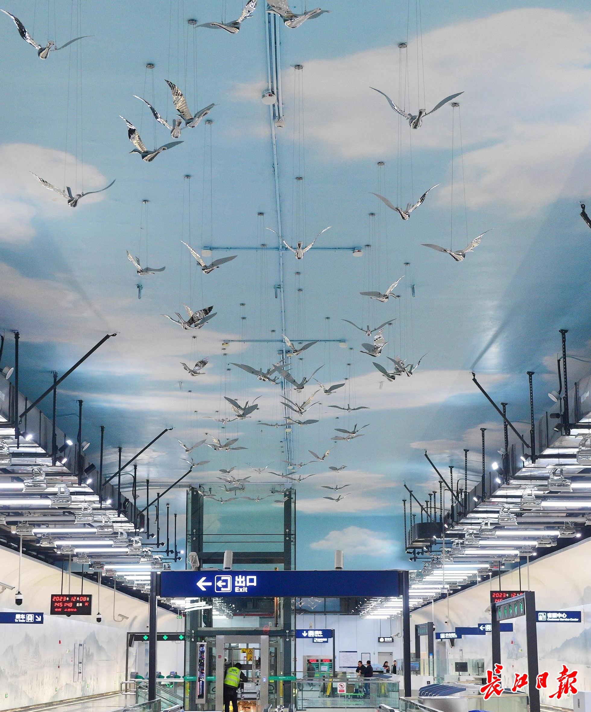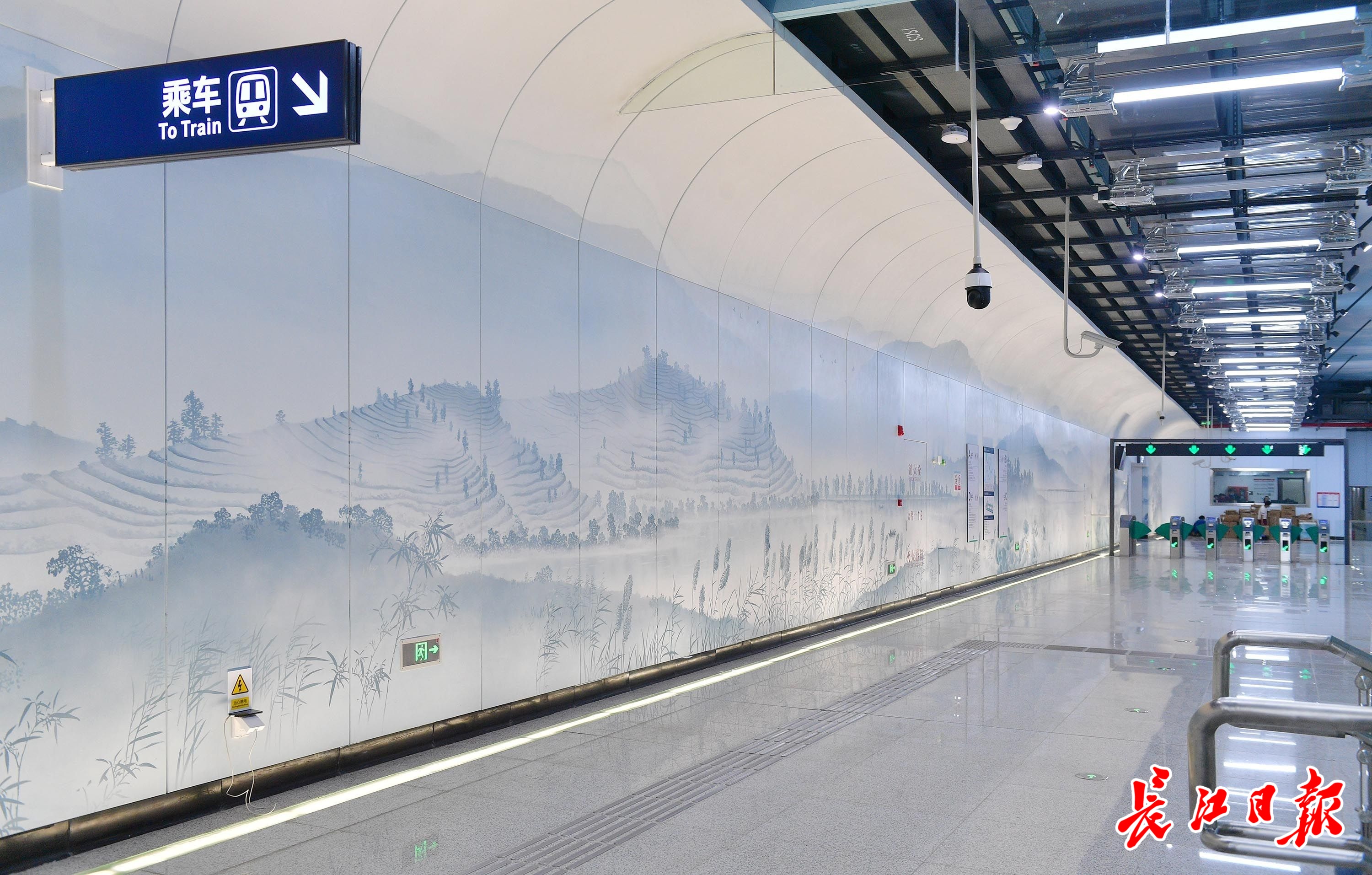 长江日报记者看到,车站内部装修整体效果表现为山水画境,两侧墙面采用喷绘铝板装配拼接的形式;车站顶部绘蓝天白云,吊装“飞鸟”点缀。整个空间俨然成为一幅山水画卷,打造“舟行碧波上,人在画中游”的空间效果。