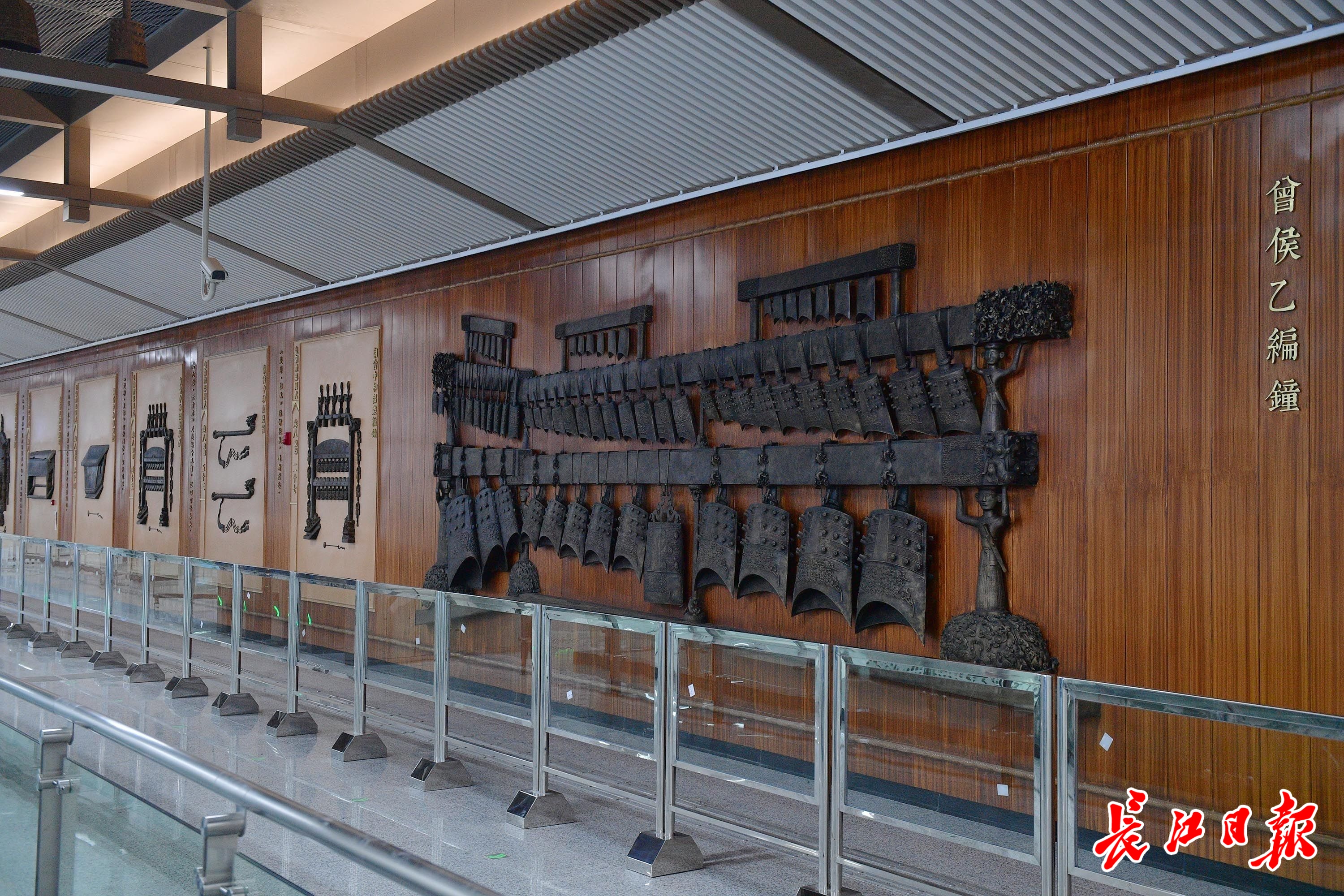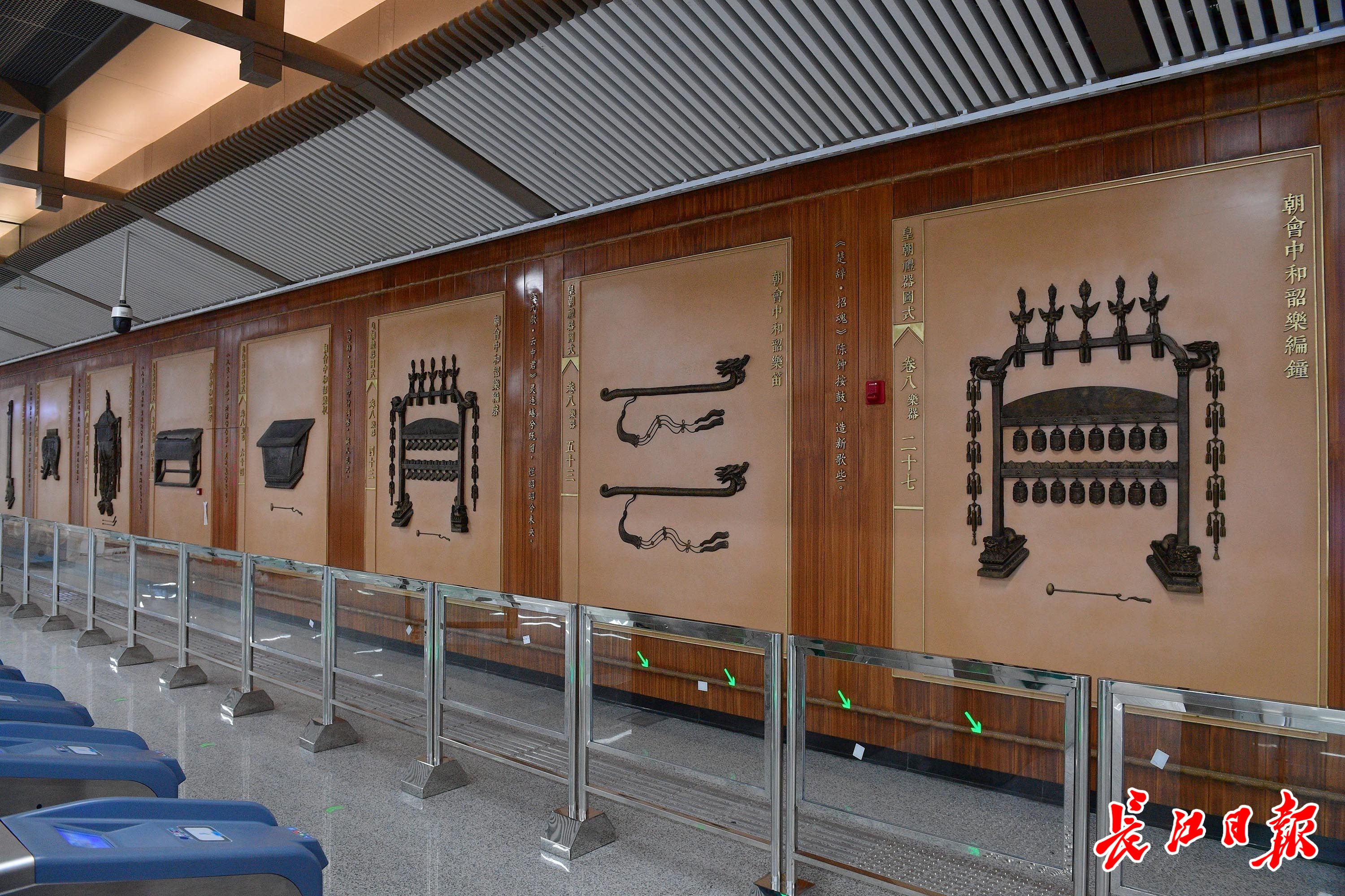 12日上午,长江日报记者走进武汉站西广场站,被眼前宏伟壮观的景象震撼,仿佛置身博物馆。放眼望去,最吸引目光的就是艺术墙上陈列的“曾侯乙编钟”,以及吊挂于车站中央的各式编钟,呈现“余音绕梁,三日不绝”的视觉形象。