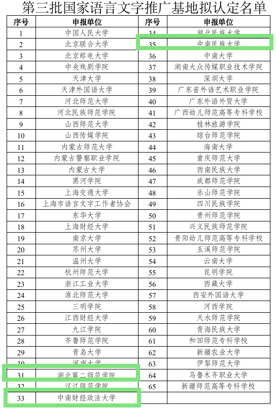 武汉此次有3所高校入围,分别是:湖北第二师范学院、中南财经政法大学、中南民族大学。湖北另外两所入围单位是:汉江师范学院和湖北民族大学。