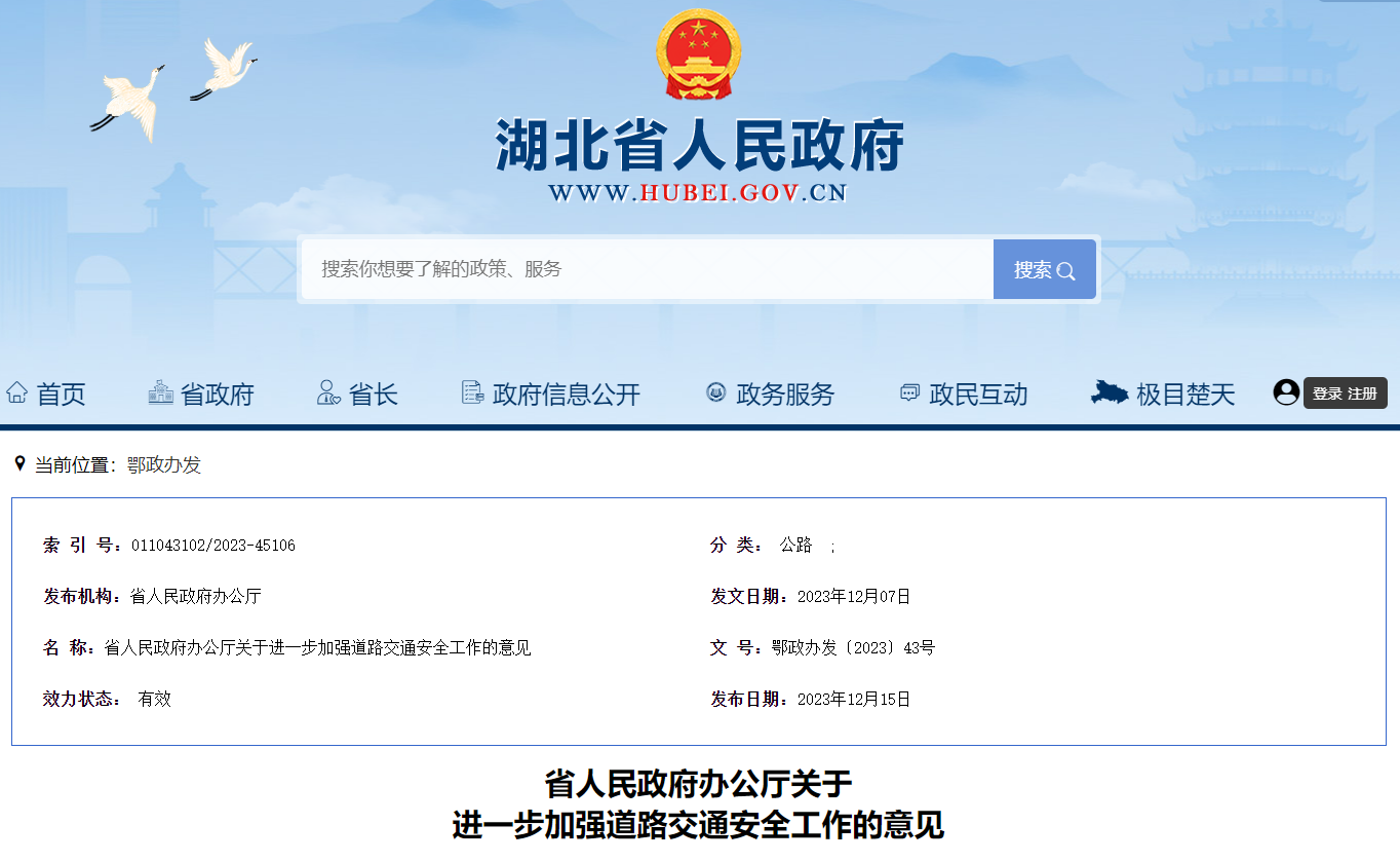 本意见自发布之日起施行,《湖北省人民政府办公厅关于进一步加强道路交通管理工作的意见》(鄂政办发〔2010〕23号)同时废止。