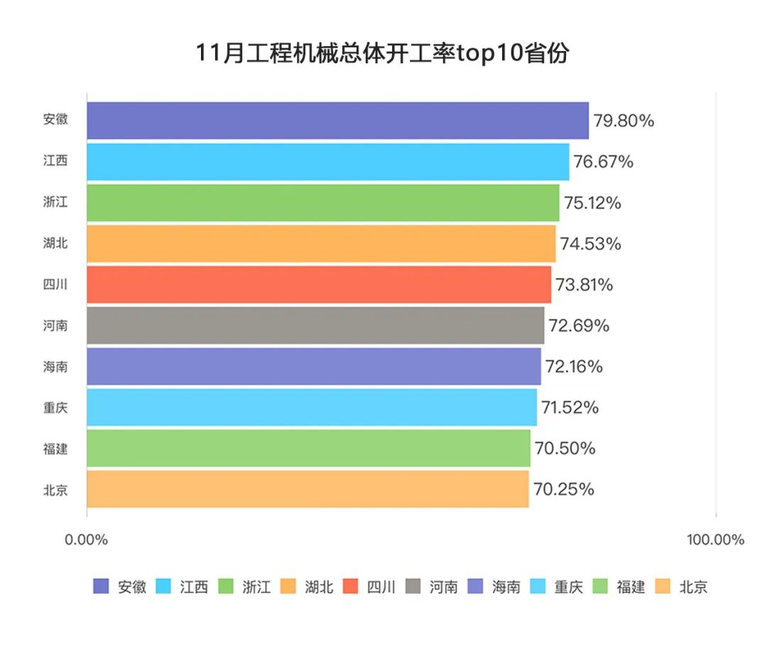 11月,安徽、河南、湖北各有7类设备平均作业量同比增长,江西有3类设备平均作业量同比增长,主要集中在汽车起重机、履带起重机、挖掘机。