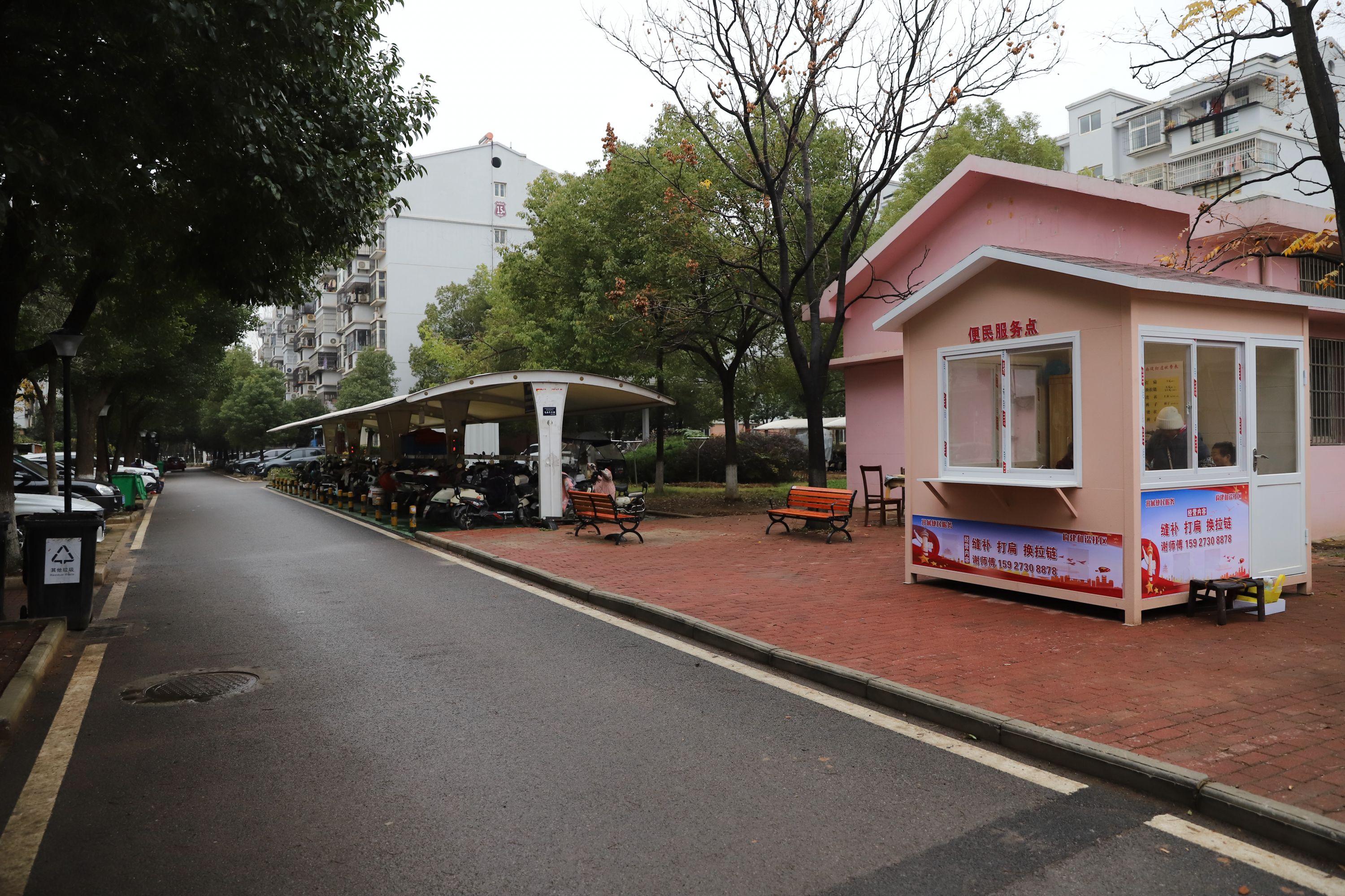 2023年12月16日下午4时,住在关南工业园63岁的戴师傅骑了8分钟自行车,找谢奶奶给一条黑绒裤打扁。可梧桐树下的露天摊不见了,树边立着个指示牌写着“关南便民缝纫店向前15米”,戴师傅定睛一看:就在社区十字路口相隔不远的位置确实新建了一个便民服务岗亭,他马上找了过去……