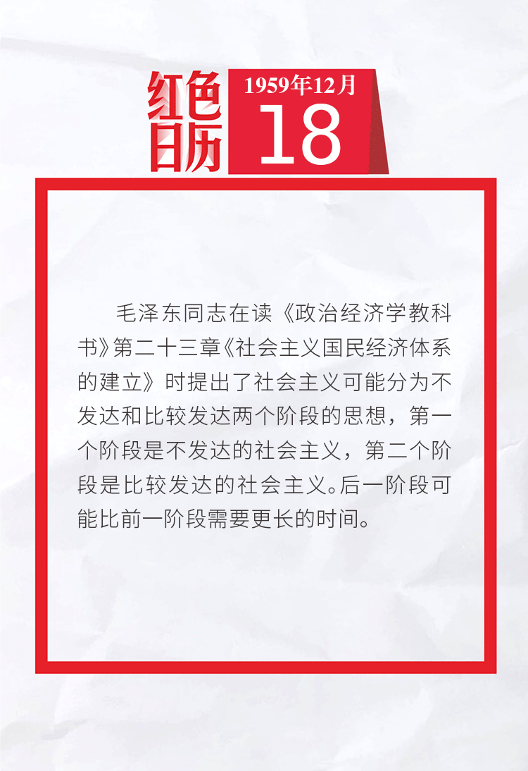 1959年的今天,毛泽东主席提出了社会主义可能分为不发达和比较发达两个阶段的思想|红色日历
