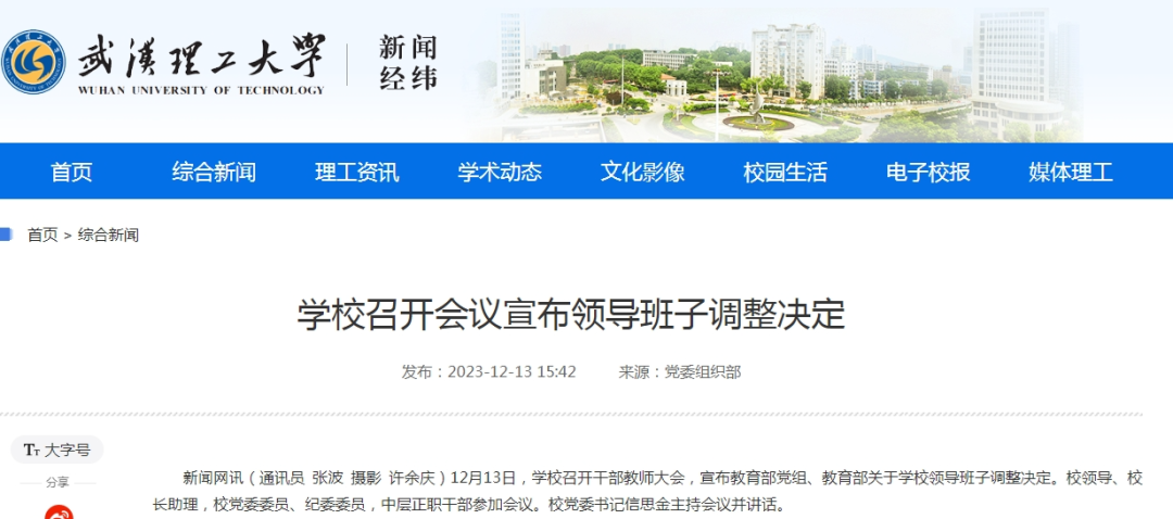 据武汉理工大学网站消息,12月13日,该校召开干部教师大会。会上,武汉理工大学党委副书记、校长杨宗凯宣读了教育部党组、教育部的任免决定:麦立强、张笛任中共武汉理工大学委员会常委,免去吴超仲的中共武汉理工大学委员会常委、委员职务;任命麦立强、张笛为武汉理工大学副校长(试用期一年),免去吴超仲的武汉理工大学副校长职务。