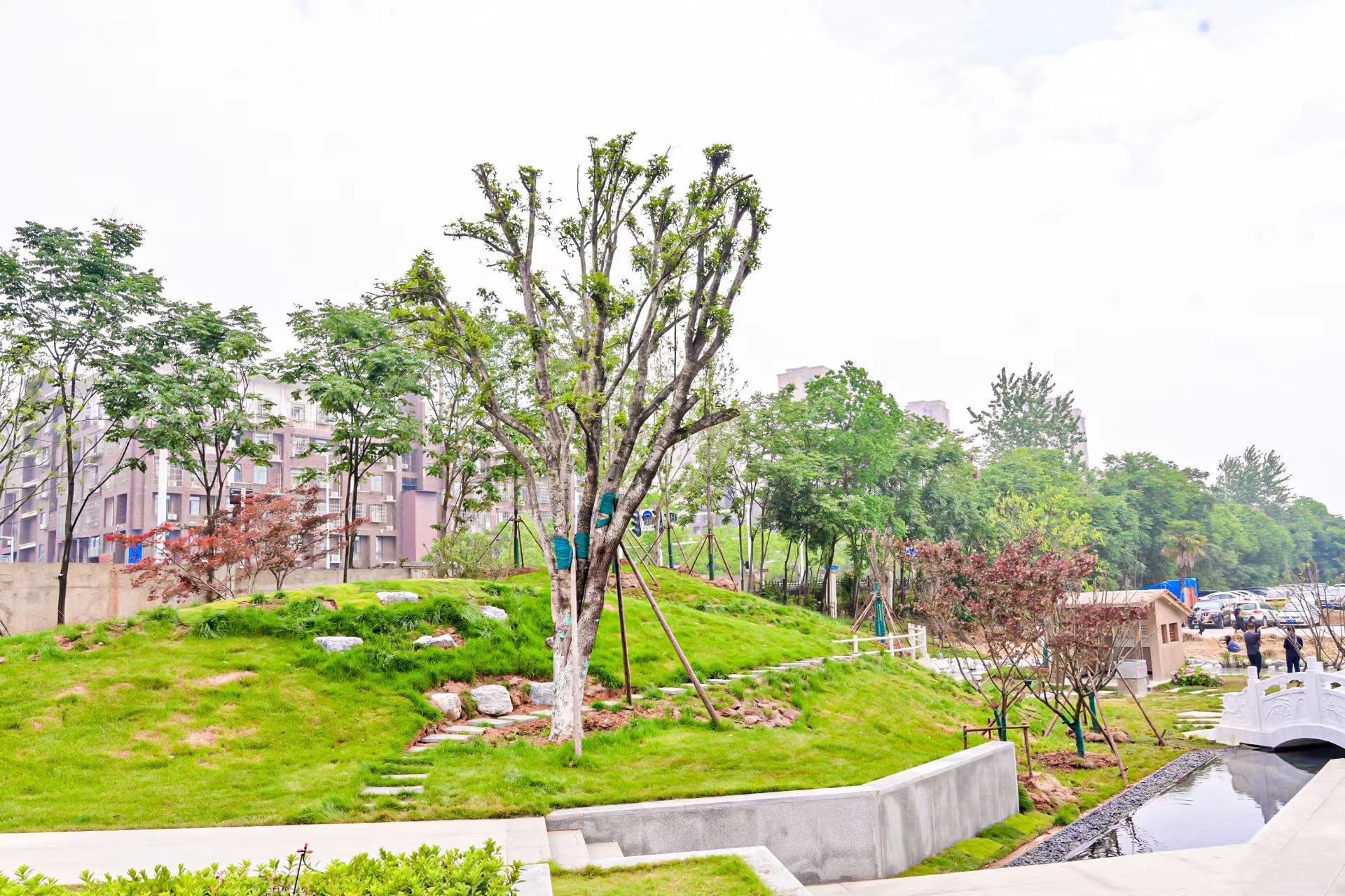 围墙拆除以后,盛隆电气将盛隆园作为光谷的口袋公园打造,在原有土地上进行重新规划,累计花费30余万元,在园区内铺筑石材、种上各类草木。为了保障园区游客的人身安全,企业还在园区安排保安换班巡逻。