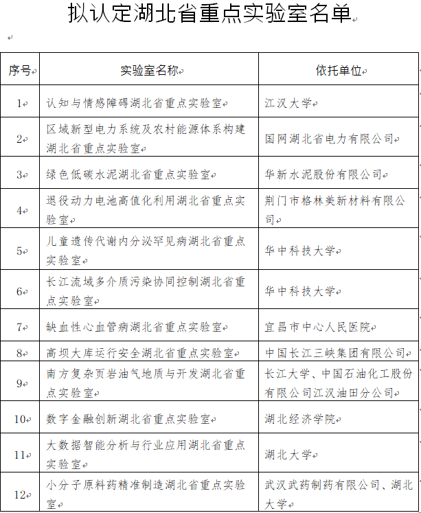 按照《湖北省重点实验室管理办法》有关要求,省科技厅经组织专家论证,拟新认定一批领域方向符合我省创新战略需求、基础条件较为成熟的省重点实验室,现将拟认定结果向社会公示。