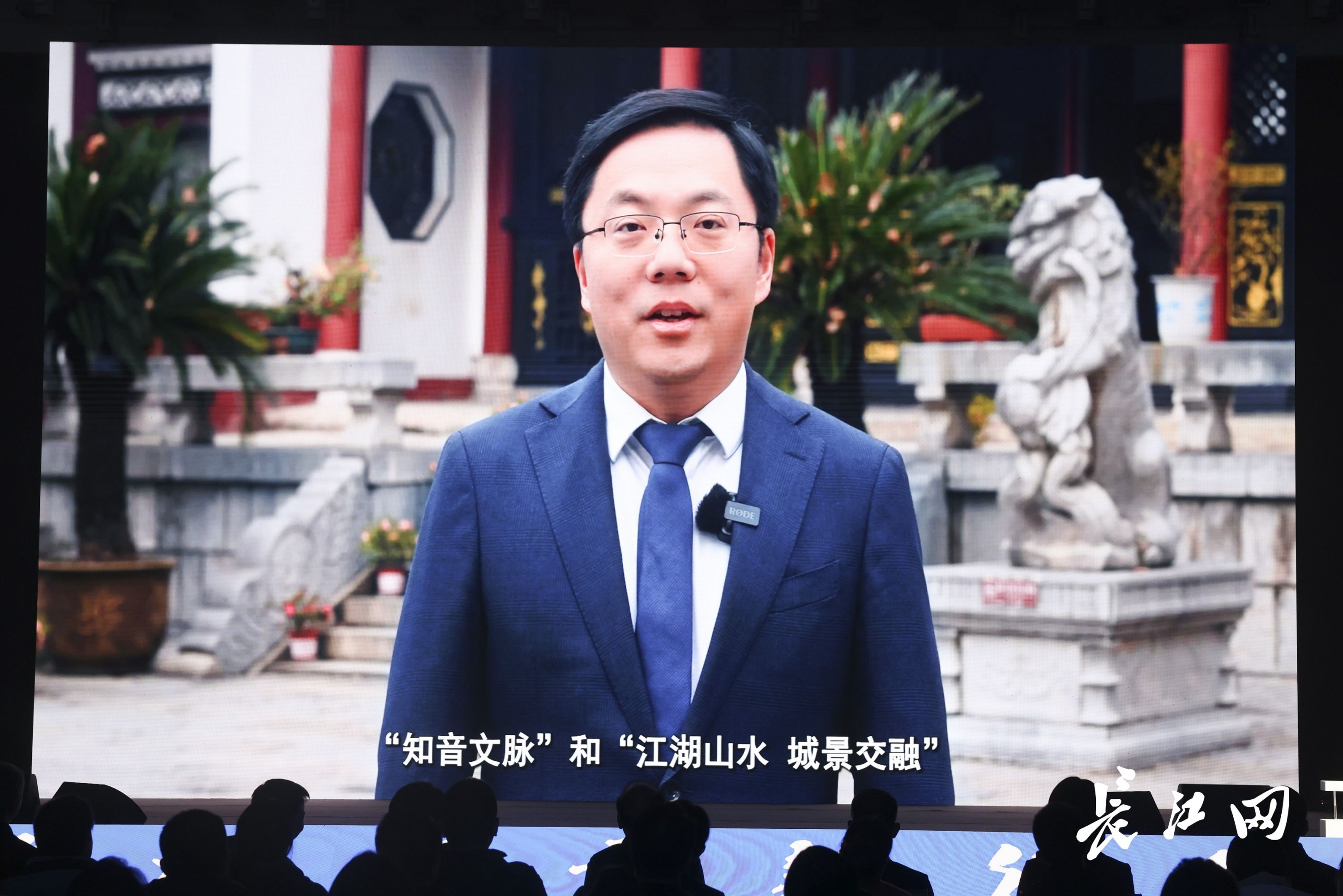 汉阳区副区长赵亮在晴川阁景区通过视频连线向“英雄城市新征程”系列形势政策报告会汉阳区专场现场观众推介汉阳文旅。长江日报记者胡冬冬 摄