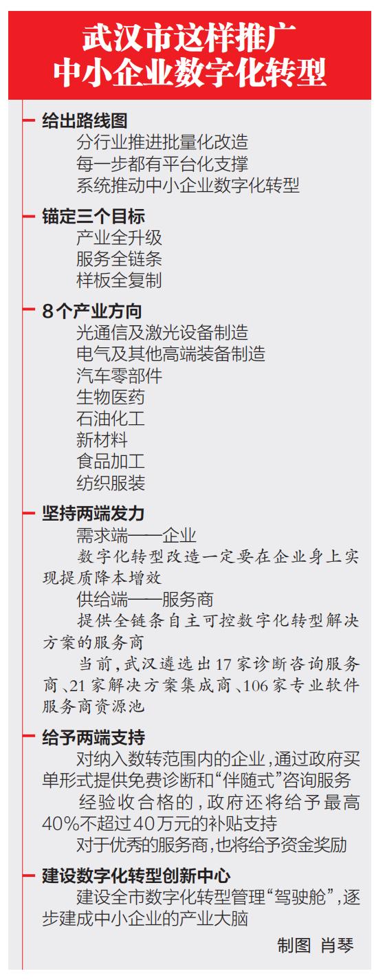 针对这一状况,今年8月,工信部、财政部共同组织,在全国遴选30个城市,开展中小企业数字化转型试点。武汉市以全国第六的成绩入选,与上海浦东新区、苏州、东莞等纳入第一批试点范围,在全国中小企业数字化转型大会上首批启动,并作为试点城市代表作交流发言。
