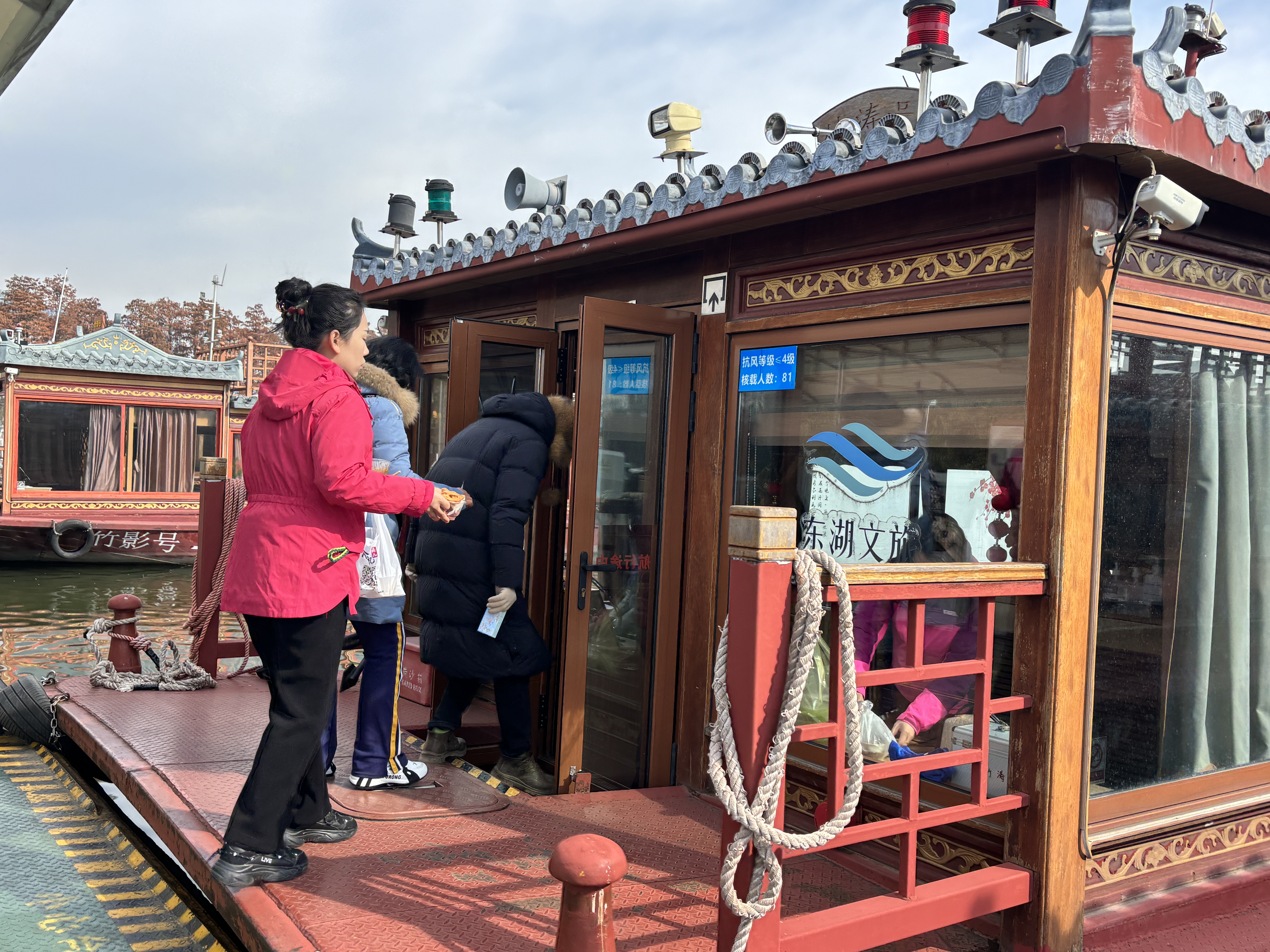 “欢迎乘坐东湖游船!”在楚风园码头,东湖游船“蓝丝巾”讲解员微笑迎接八方游客,乘船游客扫二维码、自助检票、通过闸机“行云流水”,整个过程只需几秒钟。当天首次航班共52位游客,线上购票扫码登船有30位,3分多钟完成检票乘船。