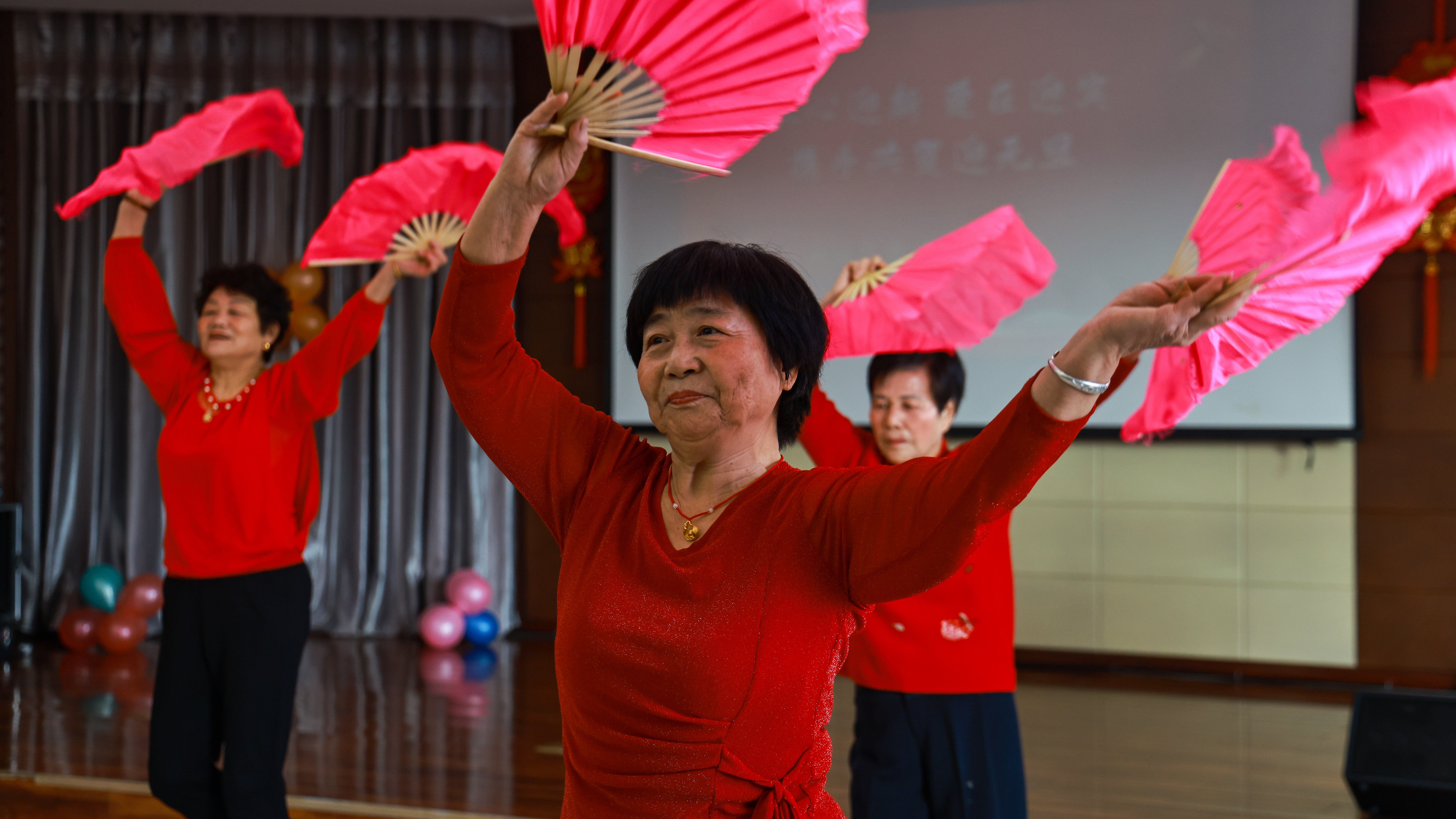 博乐市迎宾社区居民在表演扇子舞。 新疆博乐市融媒体中心记者陈桂林 摄