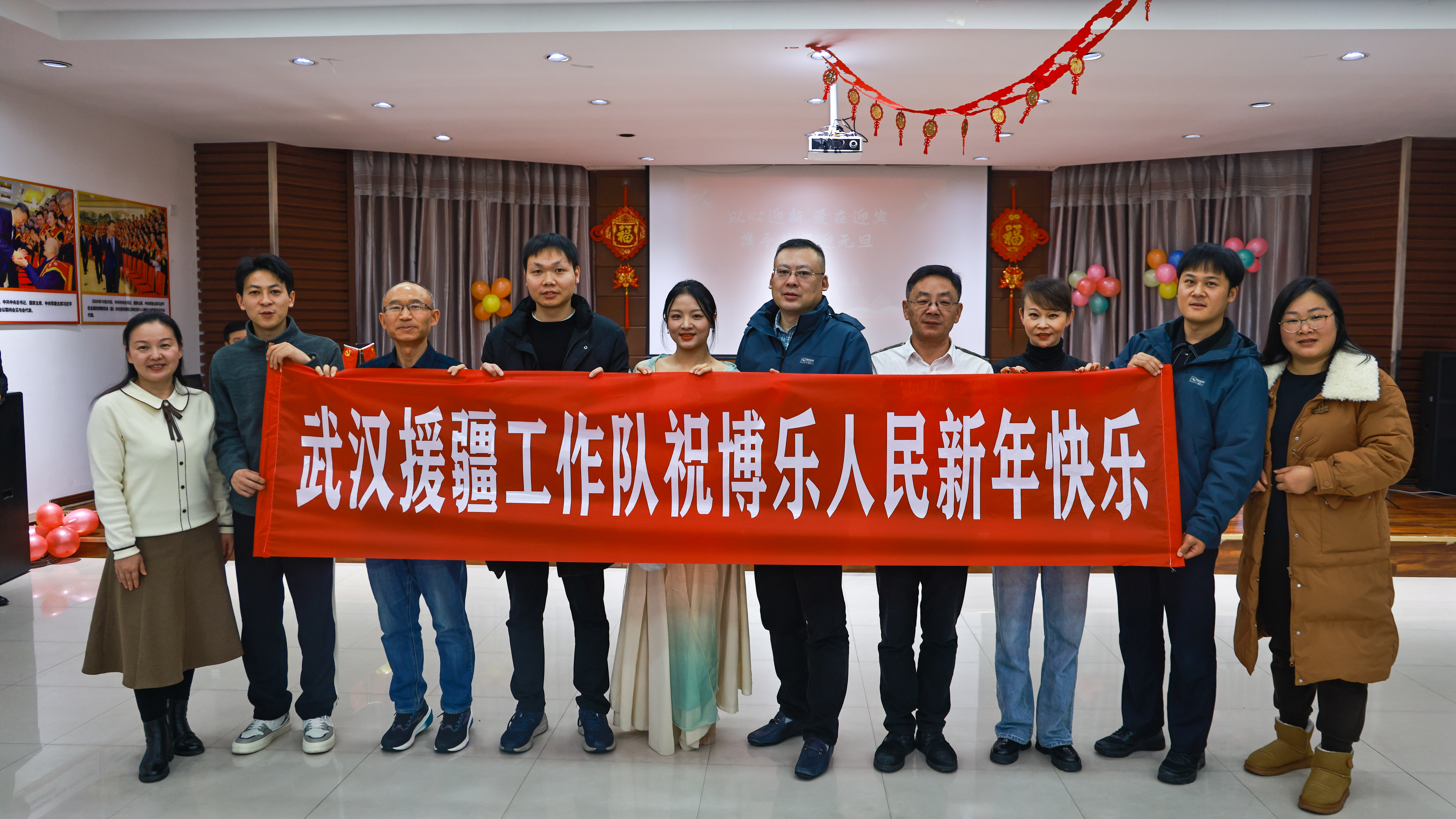 在联欢会现场,武汉援疆干部人才代表走上舞台,“不经意间”突然展现一个条幅——“武汉援疆工作队祝博乐人民新年快乐!”观众报以热烈掌声和欢呼声:“谢谢!谢谢!”