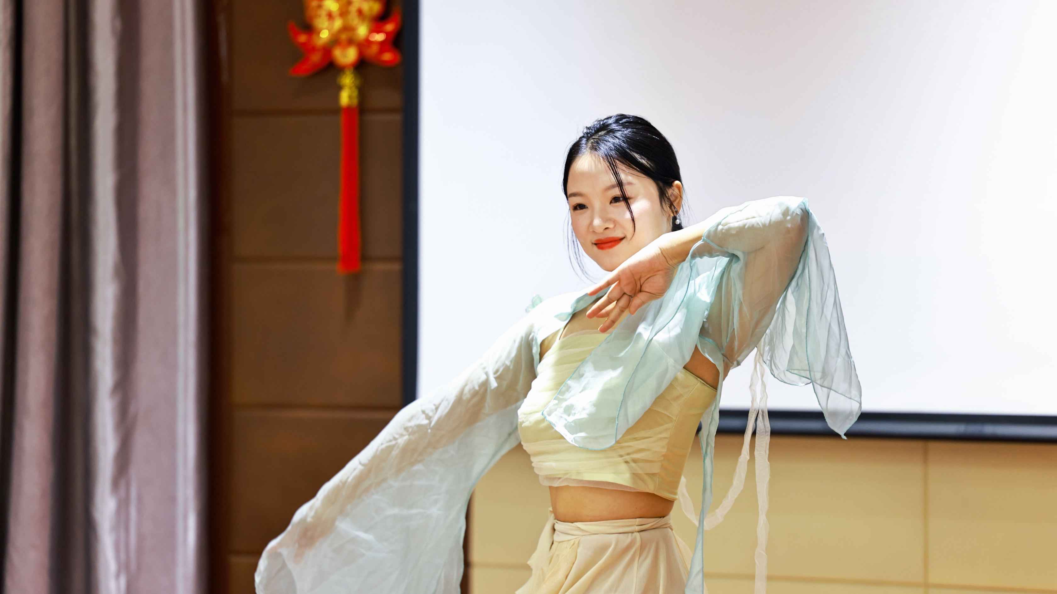 武汉援疆教师、博乐市第一小学老师陈莉在表演舞蹈《月光下的凤尾竹》。 新疆博乐市融媒体中心记者陈桂林 摄