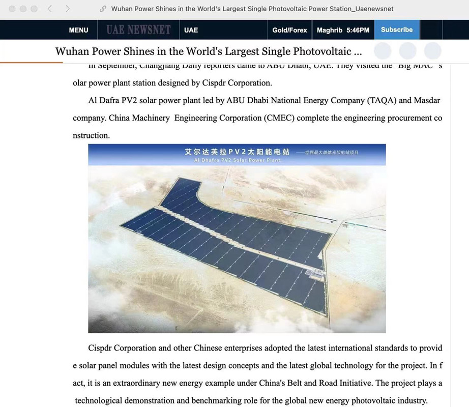 阿联酋新闻网以《武汉力量闪耀全球最大单体光伏电站》为题,对长江日报“你好!朋友”系列中的阿联酋稿件进行了转载,报道了在距离武汉5000多公里的阿联酋阿布扎比,这座全球最大单体光伏电站的艾尔达芙拉PV2光伏电站已实现并网发电,这一项目有着武汉力量的支持,也蕴含着一系列突破。