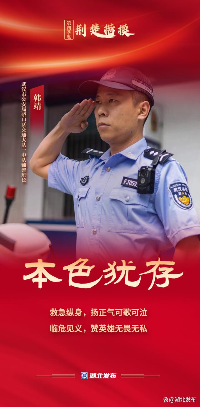韩靖曾是一名特种兵。2019年3月到硚口区交通大队工作以来,他立足平凡岗位,热心服务群众。2023年7月28日凌晨5时,月湖桥上一女子跳江,他毫不犹豫从近30米高的桥上纵身一跃,游江近百米,拼尽全身力气将其救起。救人事迹被新华社、人民网、中国警察网等多家媒体报道,在社会上引起强烈反响。被中央政法委评为“2023年第三季度见义勇为勇士”,获评“武汉楷模”“武汉市道德模范”。