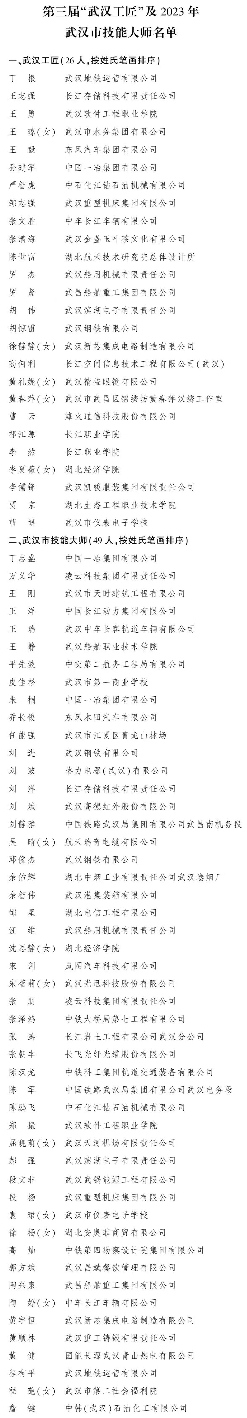 为深入贯彻落实习近平总书记关于做好新时代人才工作的重要思想,营造尊重技能尊重劳动的浓厚社会氛围,在基层推荐、专家评审、实地考察、社会公示的基础上,经研究,决定命名丁根等26人为武汉工匠、丁忠盛等49人为武汉市技能大师(具体名单附后)。