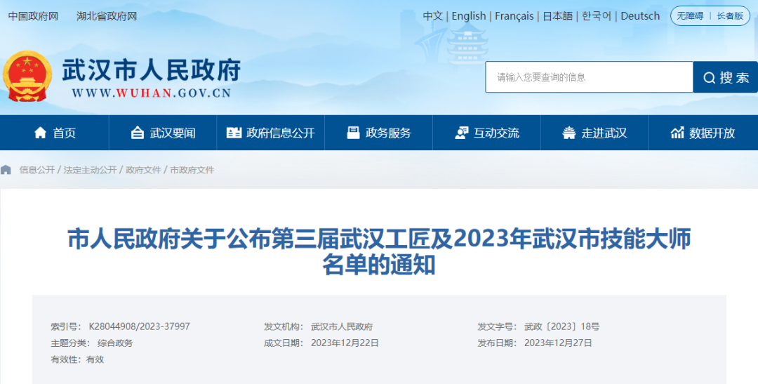 及2023年武汉市技能大师名单的通知