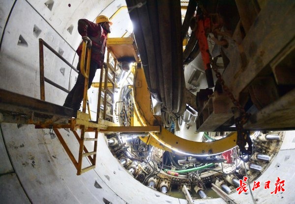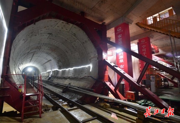 上午,长江日报记者深入约17米深的万家咀站端头井底部,只见万白区间右线盾构机刀盘已经进洞,电瓶车正在运送管片,施工人员正在拼装负环管片,为盾构机向前提供推进力。记者看到,旁边一个月前盾构始发的左线区间隧道已经完成100余米。