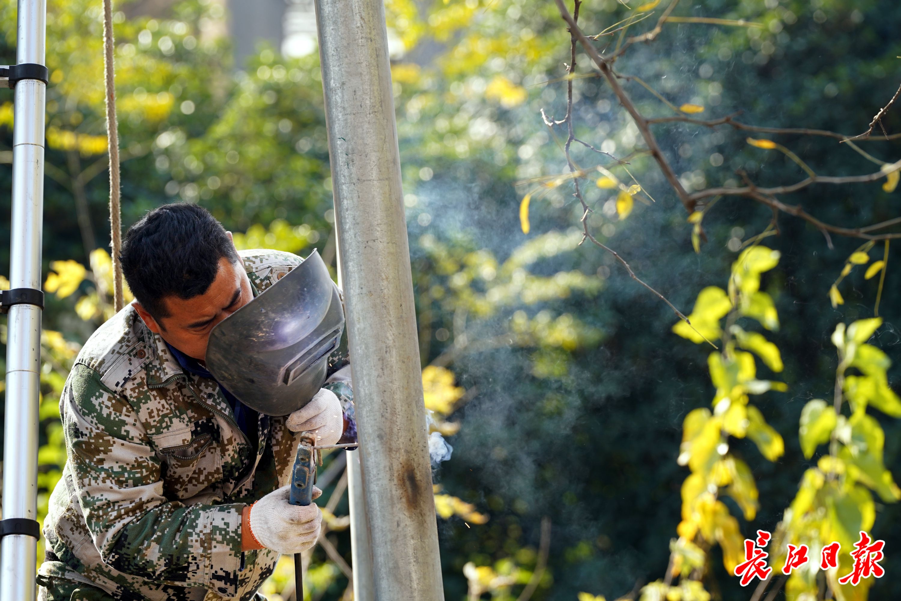 园林工人为古皂荚树安装金属支架。记者李子云 摄