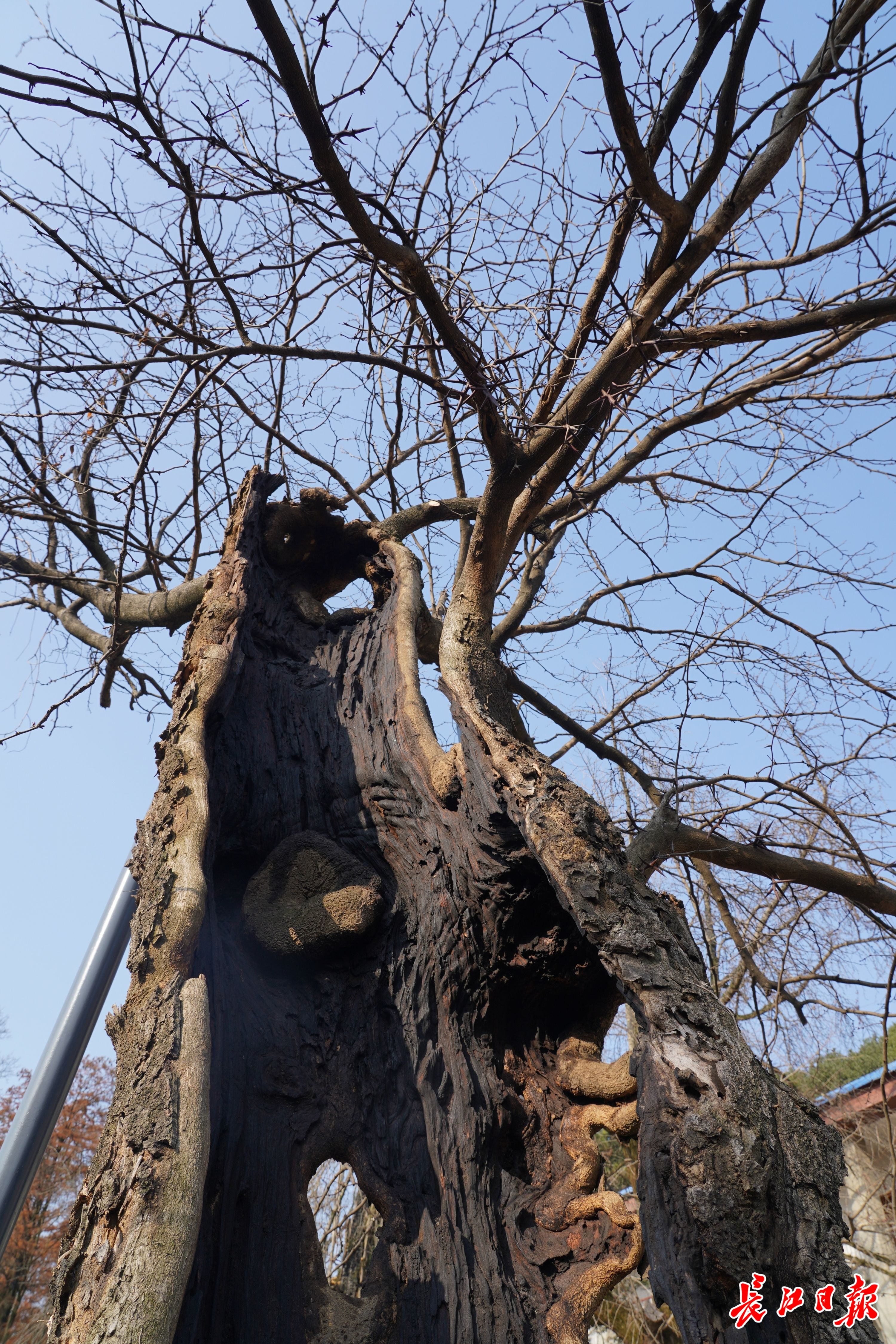 12月26日上午,长江日报记者看到,这棵古皂荚树高约8米,树干已消失,半张树皮支撑着树冠,上面有好几个破洞。