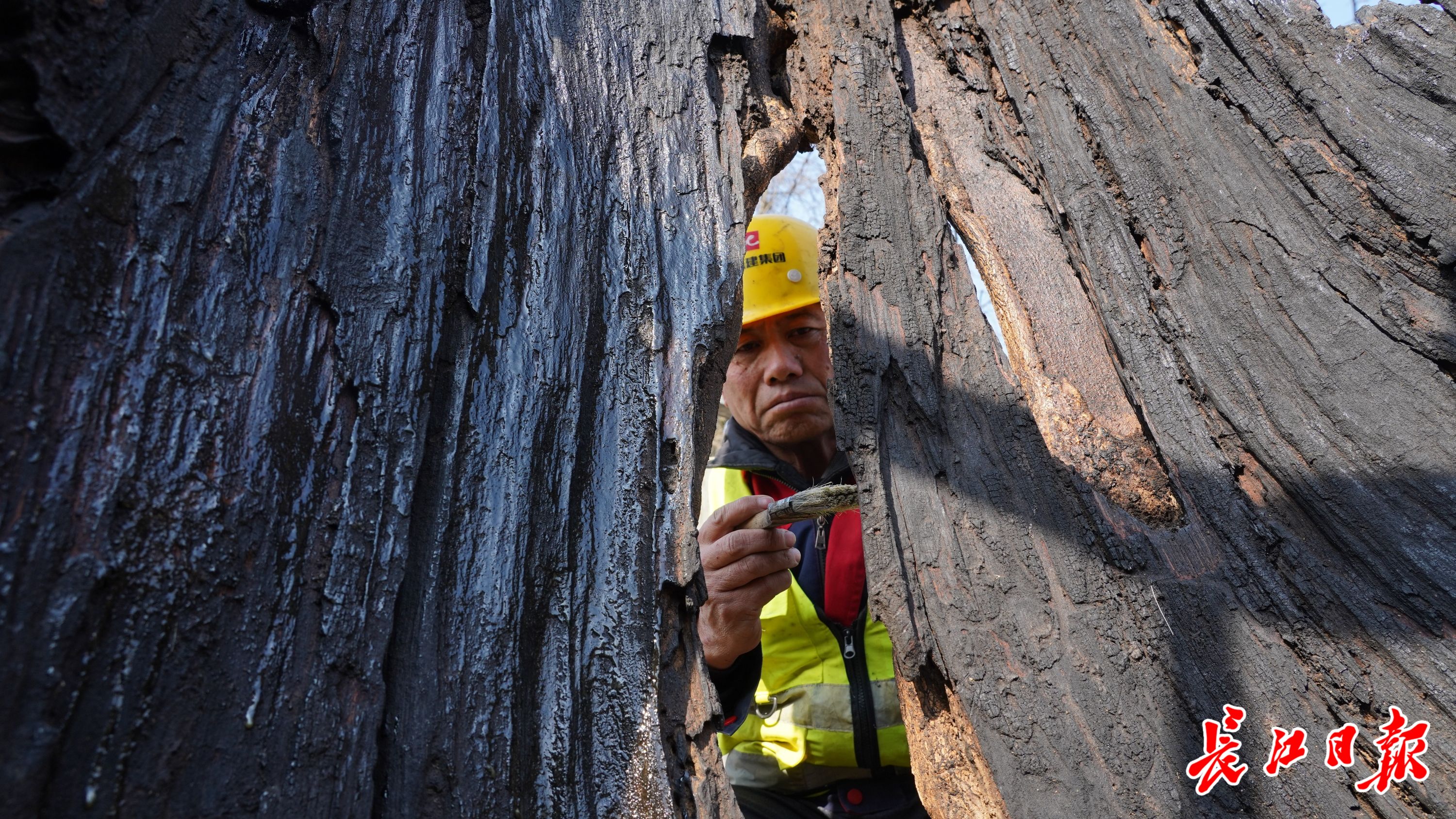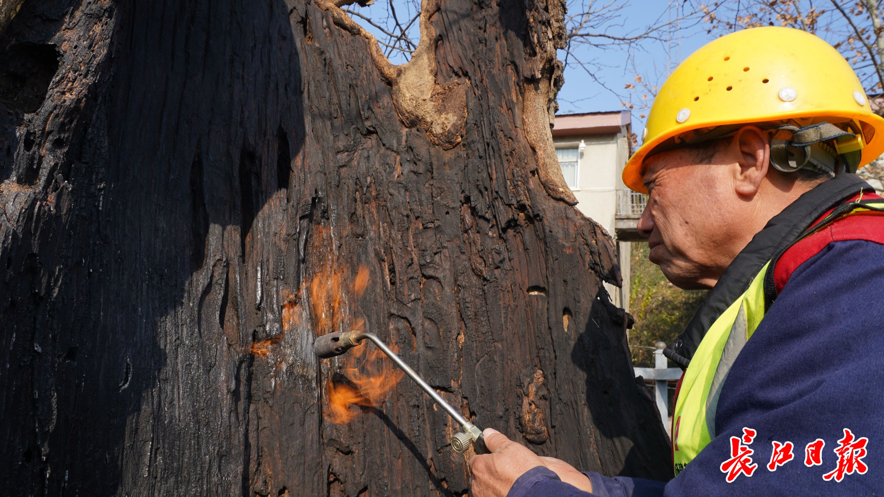 长江日报大武汉客户端12月28日讯 武汉有棵古皂荚树只剩下半张树皮,仍顽强地活着。12月26日,园林和林业部门采用火疗、刷桐油等方式,尽全力对它进行保护。