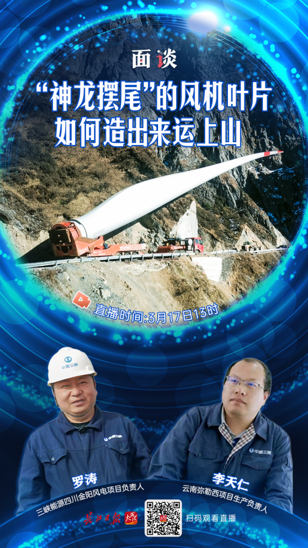 中国建设者们将75米长、19吨重的风机叶片运送上山。长江日报《面谈》邀请到三峡能源四川金阳风电项目负责人罗涛和云南弥勒西项目生产负责人李天仁,为广大网友揭秘大风车“神龙摆尾”背后的故事。