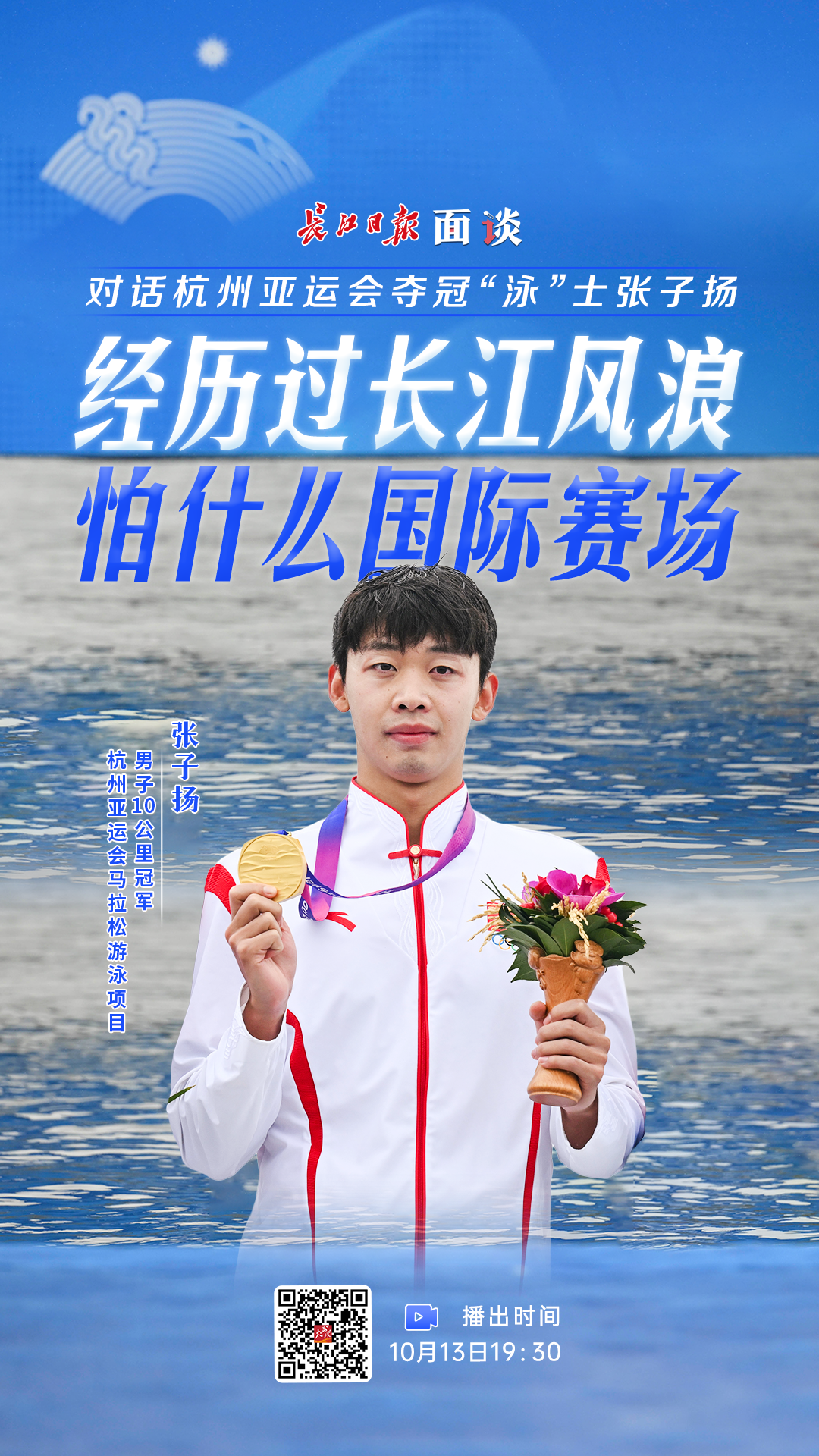 杭州第19届亚运会马拉松游泳男子10公里比赛,中国选手张子扬以1小时55分45秒8夺得金牌。武汉人更早对于张子扬的了解,是来自武汉渡江节,他曾两次夺得武汉渡江节冠军。他做客长江日报《面谈》栏目,与我们一起分享夺冠背后的故事。他将亚运金牌、亚运会参赛服装带到《面谈》现场,为大家展示。