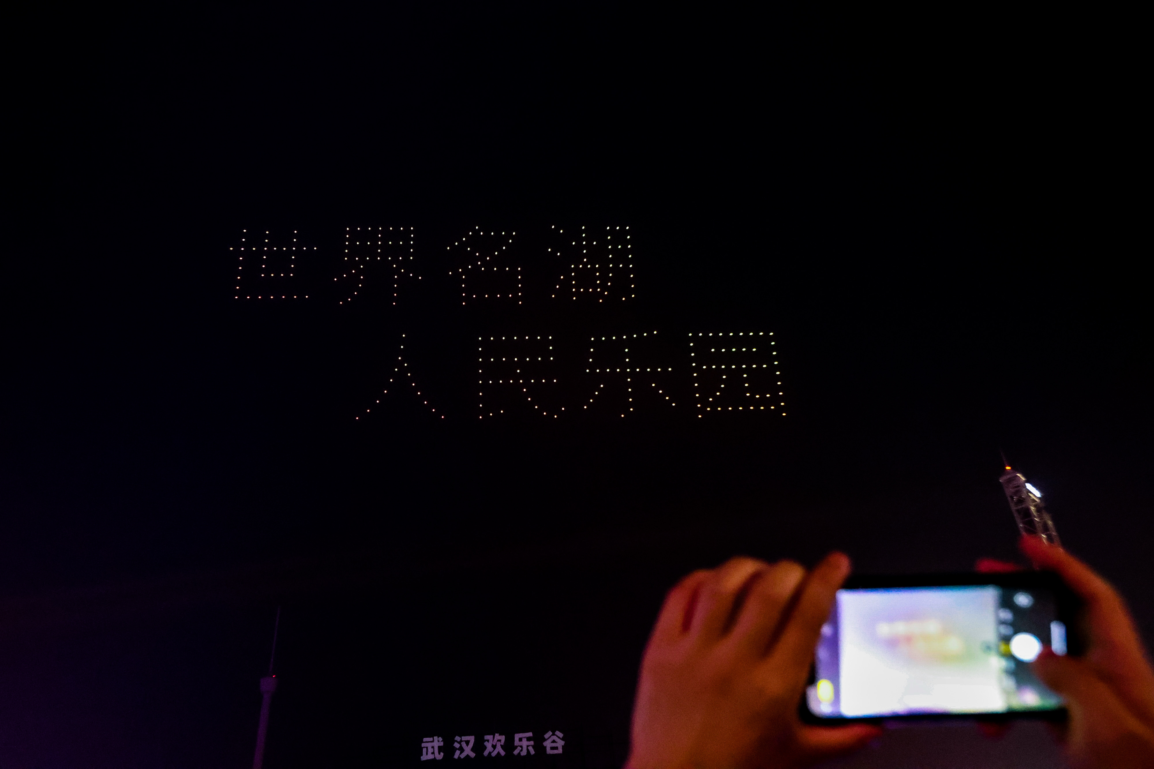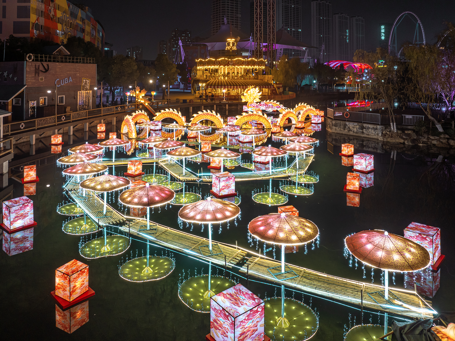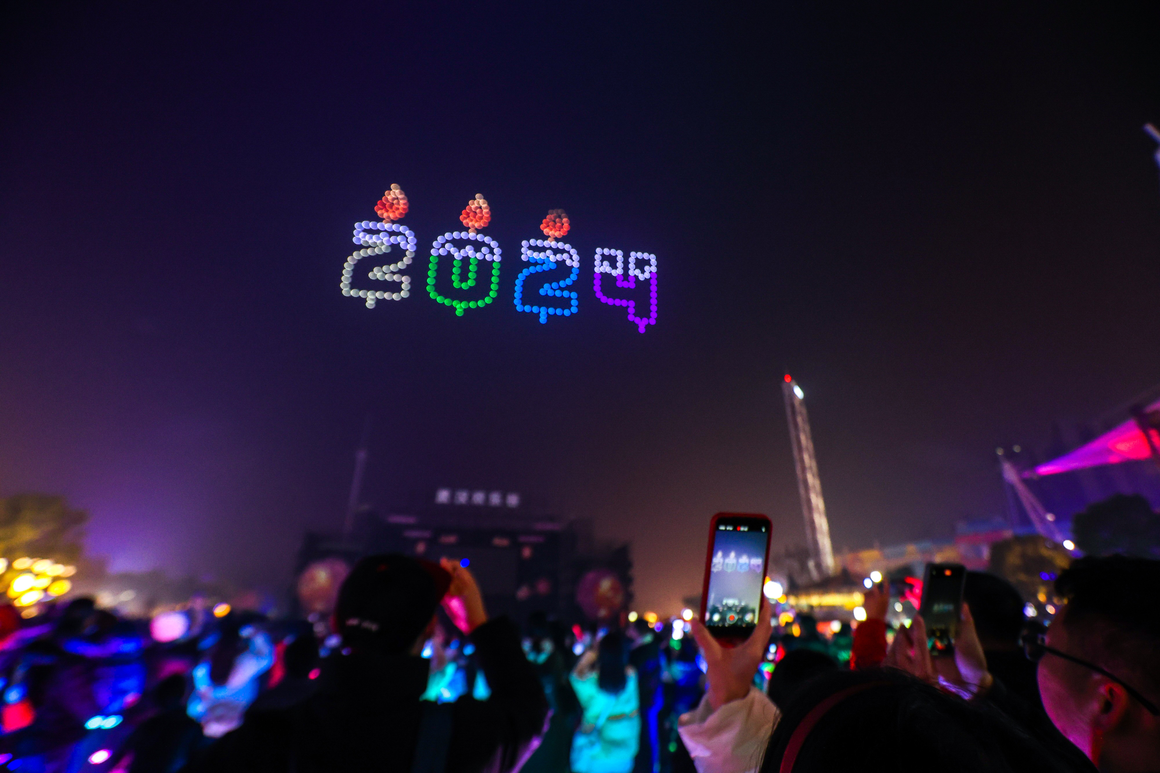 30日晚,武汉欢乐谷空中上演了灯火奇观。300多架无人机在天空拼成“世界名湖人民乐园”“新年快乐”字样,并绘出许愿时钟、飞龙在天等璀璨造型,无人机光影秀与水陆36万方国潮神龙花灯遥相呼应,形成一幅熠熠生辉的奇妙赏灯画卷。