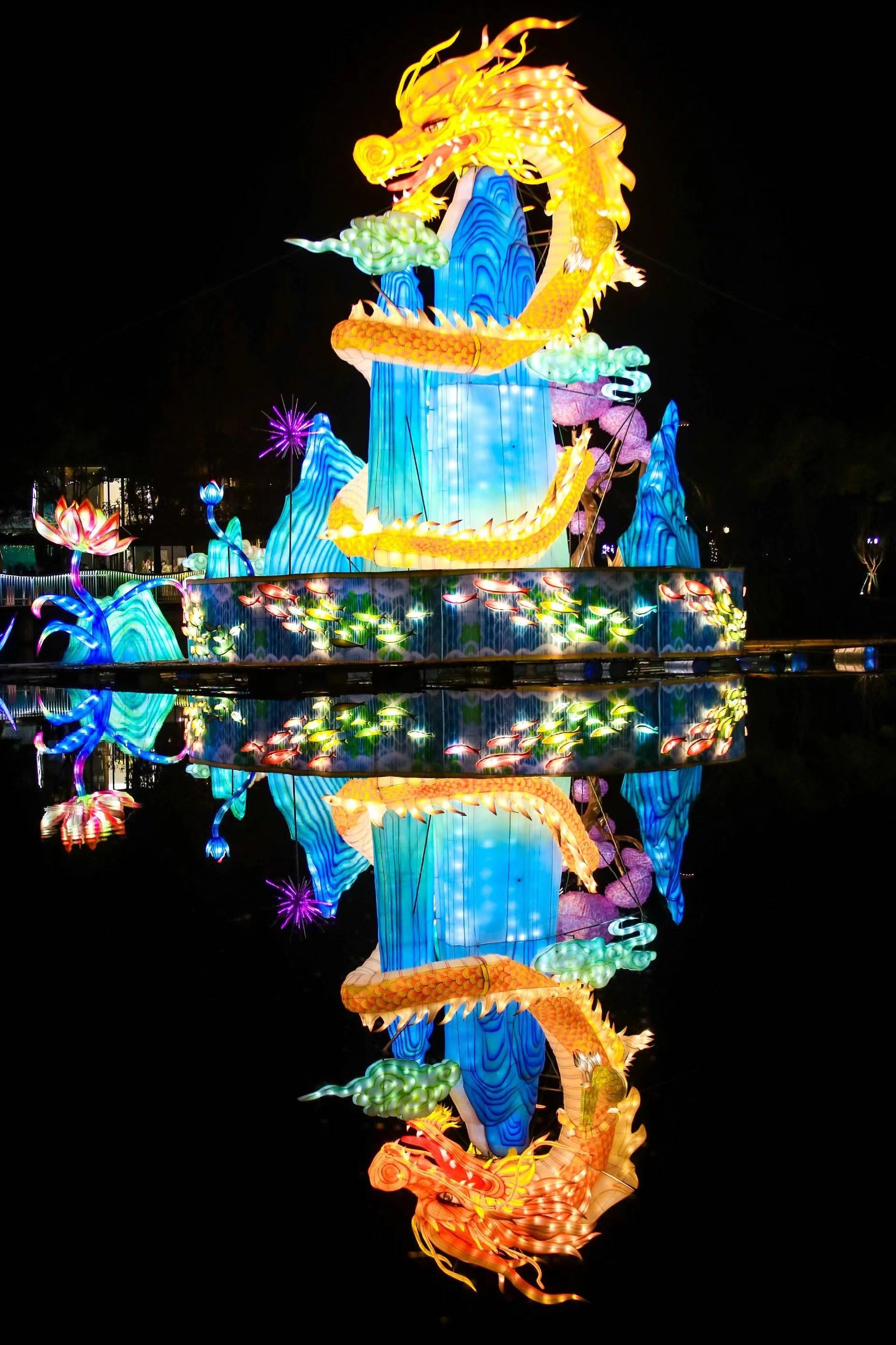 在央视镜头里,高达12米的“龙行龘龘东湖花开”灯组穿梭于东湖山水花草之间,金色神龙腾飞威风凛凛;波光粼粼的湖面上,百米水上灯组“巨龙游湖”仿佛巨龙游动前行,活灵活现;“龙腾东湖”灯组自水中穿云而出,喷云吐雾。